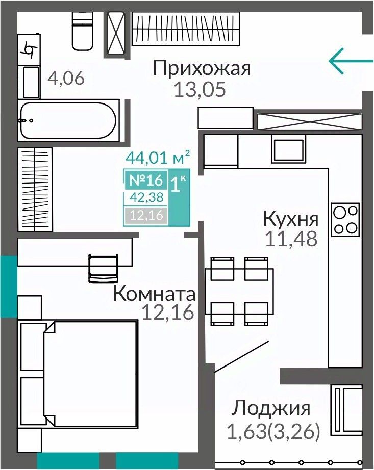 57 м² · Этаж 12 из 16