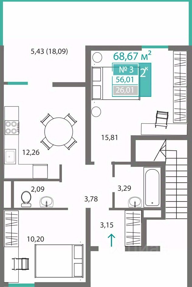 58 м² · Этаж 15 из 16