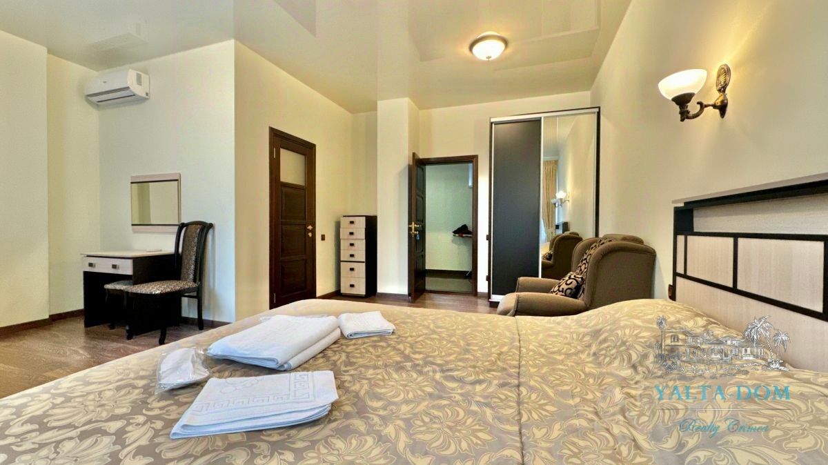 Современная вилла с видовым участком в живописном р-не Ялты у подножия гор в 100 м. от заповедника и реликтовых сосен. Комплекс о.п. 554 м2 включает в себя: Виллу в 2 этажа с цоколем о.п. 250 м2. В цоколе хамам, парная из липы и африканского дуба (Абаш), с/у, душевая и бассейн. В доме 3 спальни с выходом террасу, детская. студия с отдельным входом, 4 с/у, крытый бассейн с морской водой и выходом на газон, винотека, кабинет, прачечная, тех-помещение. холл, кухня-гостиная и столовая с выходом на террасу. Общая система вентиляции с кондиционированием. Отопление теплые полы и радиаторы. Летний домик для приема гостей о.п. 40 м2 с зоной BBQ и выходом на газон. Отдельно запущен действующий бизнес со стабильным доходом в виде 6 студий с отдельным подъездом и парковкой о.п. 150 м2. Участок 8.4 сотки, 3 из которых для высадки сада. На комплексе 2 газовые котельные, два резервуара с водой, автоматический электрогенератор. По желанию остается специалист для обслуживания коммуникаций с функцией садовника. Возможна деятельность мануальщика и косметолога. К строительству применены современные технологии и качественные материалы. Интерьер-дизайн с элементами 3D. Все коммуникации, СВЕТ 42 кВт, выделенная линия интернет, 8 видеокамер по периметру. Ливневый водосточный колодец с дренажной системой в двух уровнях. Автоматический полив газона. На воротах немецкая автоматика. Деревянные поверхности из лиственницы класса ЭКСТРА. Остекление энергосберегающее из алюминиевого профиля с раздвижными системами, ограждение триплекс. Участок выбирался, что бы не перекрывался вид на окружающую природу, а близость заповедника позволяла пользоваться уникальными свойствами хвойного леса, воздух которого особенно полезен для людей с заболеваниями легочной системы. С территории открывается прямой вид на Ялту, море, горы, водопад Учан-Су, Ай-Петри и гору Ставри-Кая, на которую можно подняться по Боткинской Тропе. В 15 минутах прогулки частный конный клуб, предоставляющий экскурсии по горным тропам. Неподалеку Казачий Храм. Необходимая инфраструктура в легком доступе. До Набережной Ялты 7 мин. на авто. ТЦ ''Конфетти'' в 3-х минутах (современные маркеты, бутики, Каток, фитнес-центр, студия Тодес, развлекательный центр для детей) В 5 мин. на авто Ливадийский Дворец, где можно прогуляться по тенистым аллеям или Царской Тропе. Цена в рублях условная. Эквивалент 2 350 000 у.е. Документы РФ, на кадастровом учете.