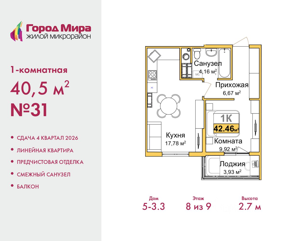 Продается однокомнатная квартира с предчистовой отделкой в ЖМ ''Город Мира'' на 8 этаже. Общая площадь: 40.5 кв.м., жилая: 9.92 кв.м., площадь просторной кухни-столовой: 17.78 кв.м. Все окна выходят на одну сторону. В квартире один балкон, один совмещенный санузел. Высота потолков 2.7 м. Квартиры в ЖК ''Город Мира'' ваш комфорт начинается здесь! ''Город Мира'' это масштабный жилой комплекс, созданный для тех, кто ценит комфорт, безопасность и гармонию с природой. Здесь продумана каждая деталь: от удобной инфраструктуры до эргономичных планировок квартир. В 2024 году микрорайон ''Город Мира'' победил в номинации ''Лучший экологический проект года в сфере строительства'' по версии премии Crimea Urban Awards. Почему выбирают наш комплекс: - Зеленый оазис живите среди природы в черте города. - Всё под рукой 2 детских сада, магазины, фитнес, медицина. - Безопасность: закрытая территория с видеонаблюдением. Наши квартиры: - Просторные планировки с кладовыми. - Лоджии с остеклением. - Автономное отопление: платите только за реальное потребление. - Предчистовая отделка, включает стяжку пола, без штукатурки стен. - Консьерж-сервис и подземный паркинг. Инфраструктура комплекса: - Детские и спортивные площадки. - Зоны отдыха с беседками. - Фитнес-клубы и салоны красоты. - Будущая школа на территории, уже функционируют два детских сада. Выгодные условия покупки: - Ипотека от 5,5%, военная ипотека от 5,5%. - Рассрочка. - Материнский капитал на первоначальный взнос. Квартира находится в корпусе 5_3.3. Дом монолитный, одноподъездный, высотой 9 этажей. В подъезде 1 грузовой лифт. Окончание строительства - 4 квартал 2026 года. Оформление сделки по договору долевого участия. #ZMD0F3
