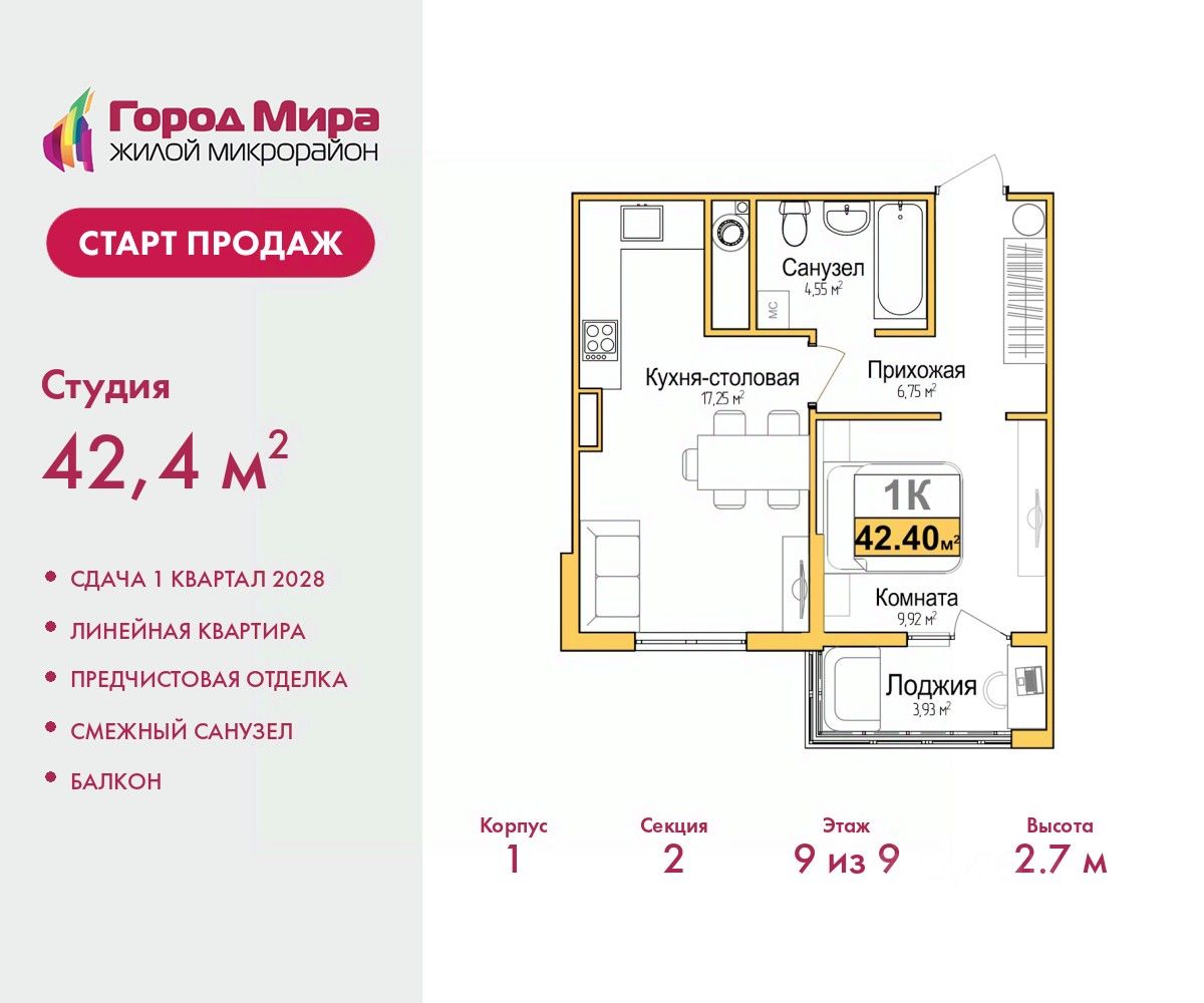Цена посчитана с учётом скидки 3% при полной оплате или ипотеке. Информация по телефону, мы вам все подробно расскажем. Двухкомнатная квартира с европланировкой и предчистовой отделкой в ЖМ ''Город Мира'' на 9 этаже. Общая площадь: 42.4 кв.м., жилая: 22.17 кв.м., суммарная площадь гостиной-столовой с кухонной зоной: 17.25 кв.м. Европейская планировка, кухня и гостиная объединены в одно просторное помещение. Комнаты изолированные, все окна выходят на одну сторону. В квартире один балкон, один совмещенный санузел. Высота потолков 2.7 м. ''Город Мира'' это масштабный жилой комплекс, созданный для тех, кто ценит комфорт, безопасность и гармонию с природой. Здесь продумана каждая деталь от удобной инфраструктуры до эргономичных планировок квартир. ''Город Мира'' победил в номинации ''Лучший экологический проект года в сфере строительства'' по версии премии Сrimеа Urbаn Аwаrds. Способы приобретения недвижимости в ''Городе Мира'': 1. Ипотека: семейная от 5,5%, военная, IT-ипотека, базовая ипотечная программа и комбо-ипотека. Одобрение заявки проходит сразу в отделе продаж. 2. Материнский капитал на первый взнос. 3. Рассрочка от застройщика - до июня 2028 года! Первоначальный взнос от 30%. 4. Военная ипотека. Участники НИС могут приобрести квартиры по спец.цене. Ключевые преимущества комплекса: удачное расположение зеленый район с благоприятным микроклиматом продуманное зонирование жилые кварталы, зоны отдыха и коммерческие объекты комфорт-класс высокое качество строительства и современные инженерные решения Почему выбирают ''Город Мира'': Образование и досуг: 2 детских сада (по 260 мест каждый) планируется строительство общеобразовательной школы детские и спортивные площадки в каждом дворе беседки для отдыха, зоны для выгула собак Ритейл и сервис: магазины, аптеки, медицинские центры фитнес-клубы, салоны красоты детские развивающие центры Парковки: гостевые парковки наземные и подземные паркинги Квартиры с продуманным комфортом: просторные планировки с гардеробными и 2-мя санузлами лоджии с остеклением автономное отопление выполнена стяжка пола Благоустройство территории: ландшафтный дизайн с зонами отдыха современные детские площадки стильные холлы с дизайнерской отделкой система видеонаблюдения для безопасности ''Город Мира'' это место, где созданы все условия для комфортной жизни. Выбирайте качество и продуманность в каждой детали! Дом монолитно-блочный, двухподъездный, высотой 9 этажей. Квартира находится во 2-й секции в корпусе 1. На этаже 5 квартир. В подъезде 1 пассажирский и 1 грузовой лифт. Окончание строительства - 1 квартал 2028 года. Оформление сделки по договору долевого участия. #Z6eSeZ