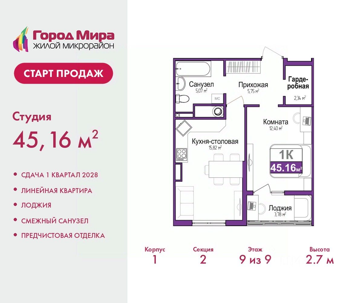 Цена посчитана с учётом скидки 3% при полной оплате или ипотеке. По всем вопросам звоните в офис продаж, мы вам все подробно расскажем. Просторная двухкомнатная квартира с европланировкой и предчистовой отделкой в ЖМ ''Город Мира'' на 9 этаже. Общая площадь: 45.16 кв.м., жилая: 23.22 кв.м., общая площадь гостиной-столовой с кухонной зоной: 15.82 кв.м. Европейская планировка, кухня и гостиная объединены в одно просторное помещение. Комнаты изолированные, все окна выходят на одну сторону. В квартире одна лоджия, один совмещенный санузел. Высота потолков 2.7 м. ''Город Мира'' это масштабный жилой комплекс, созданный для тех, кто ценит комфорт, безопасность и гармонию с природой. Здесь продумана каждая деталь от удобной инфраструктуры до эргономичных планировок квартир. ''Город Мира'' победил в номинации ''Лучший экологический проект года в сфере строительства'' по версии премии Сrimеа Urbаn Аwаrds. Способы приобретения недвижимости в ''Городе Мира'': 1. Ипотека: семейная от 5,5%, военная, IT-ипотека, базовая ипотечная программа и комбо-ипотека. Одобрение заявки проходит сразу в отделе продаж. 2. Материнский капитал на первый взнос. 3. Рассрочка от застройщика - до июня 2028 года! Первоначальный взнос от 30%. 4. Военная ипотека. Участники НИС могут приобрести квартиры по спец.цене. Ключевые преимущества комплекса: удачное расположение зеленый район с благоприятным микроклиматом продуманное зонирование жилые кварталы, зоны отдыха и коммерческие объекты комфорт-класс высокое качество строительства и современные инженерные решения Почему выбирают ''Город Мира'': Образование и досуг: 2 детских сада (по 260 мест каждый) планируется строительство общеобразовательной школы детские и спортивные площадки в каждом дворе беседки для отдыха, зоны для выгула собак Ритейл и сервис: магазины, аптеки, медицинские центры фитнес-клубы, салоны красоты детские развивающие центры Парковки: гостевые парковки наземные и подземные паркинги Квартиры с продуманным комфортом: просторные планировки с гардеробными и 2-мя санузлами лоджии с остеклением автономное отопление выполнена стяжка пола Благоустройство территории: ландшафтный дизайн с зонами отдыха современные детские площадки стильные холлы с дизайнерской отделкой система видеонаблюдения для безопасности ''Город Мира'' это место, где созданы все условия для комфортной жизни. Выбирайте качество и продуманность в каждой детали! Дом монолитно-блочный, двухподъездный, высотой 9 этажей. Квартира находится во 2-й секции в корпусе 1. На этаже 5 квартир. В подъезде 1 пассажирский и 1 грузовой лифт. Окончание строительства - 1 квартал 2028 года. Оформление сделки по договору долевого участия. #zmesEm