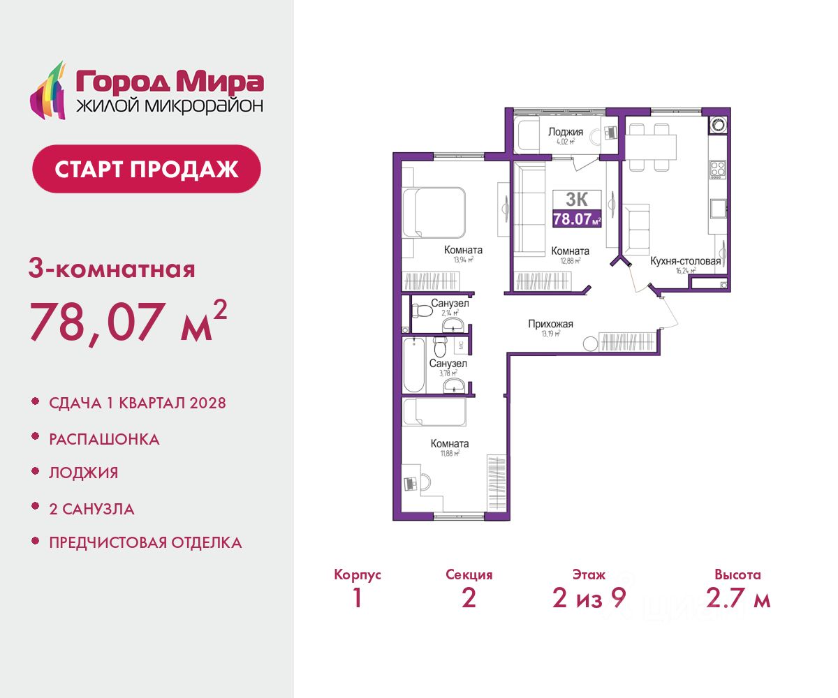 Цена посчитана с учётом скидки 3% при полной оплате или ипотеке. Звоните, наши менеджеры вам все расскажут. Продается 3-комн. квартира с предчистовой отделкой в ЖМ ''Город Мира'' на 6 этаже. Общая площадь: 78.07 кв.м., жилая: 38.83 кв.м., площадь просторной кухни-столовой: 16.76 кв.м. Квартира - распашонка, без проходных комнат, окна выходят на paзные стороны дома. В квартире одна лоджия, один совмещенный и один раздельный санузел. Высота потолков 2.7 м. ''Город Мира'' это масштабный жилой комплекс, созданный для тех, кто ценит комфорт, безопасность и гармонию с природой. Здесь продумана каждая деталь от удобной инфраструктуры до эргономичных планировок квартир. ''Город Мира'' победил в номинации ''Лучший экологический проект года в сфере строительства'' по версии премии Сrimеа Urbаn Аwаrds. Способы приобретения недвижимости в ''Городе Мира'': 1. Ипотека: семейная от 5,5%, военная, IT-ипотека, базовая ипотечная программа и комбо-ипотека. Одобрение заявки проходит сразу в отделе продаж. 2. Материнский капитал на первый взнос. 3. Рассрочка от застройщика - до июня 2028 года! Первоначальный взнос от 30%. 4. Военная ипотека. Участники НИС могут приобрести квартиры по спец.цене. Ключевые преимущества комплекса: удачное расположение зеленый район с благоприятным микроклиматом продуманное зонирование жилые кварталы, зоны отдыха и коммерческие объекты комфорт-класс высокое качество строительства и современные инженерные решения Почему выбирают ''Город Мира'': Образование и досуг: 2 детских сада (по 260 мест каждый) планируется строительство общеобразовательной школы детские и спортивные площадки в каждом дворе беседки для отдыха, зоны для выгула собак Ритейл и сервис: магазины, аптеки, медицинские центры фитнес-клубы, салоны красоты детские развивающие центры Парковки: гостевые парковки наземные и подземные паркинги Квартиры с продуманным комфортом: просторные планировки с гардеробными и 2-мя санузлами лоджии с остеклением автономное отопление выполнена стяжка пола Благоустройство территории: ландшафтный дизайн с зонами отдыха современные детские площадки стильные холлы с дизайнерской отделкой система видеонаблюдения для безопасности ''Город Мира'' это место, где созданы все условия для комфортной жизни. Выбирайте качество и продуманность в каждой детали! Дом монолитно-блочный, двухподъездный, высотой 9 этажей. Квартира находится в 1-й секции в корпусе 1. На этаже 5 квартир. В подъезде 1 пассажирский и 1 грузовой лифт. Окончание строительства - 1 квартал 2028 года. Оформление сделки по договору долевого участия. #ZMesE9