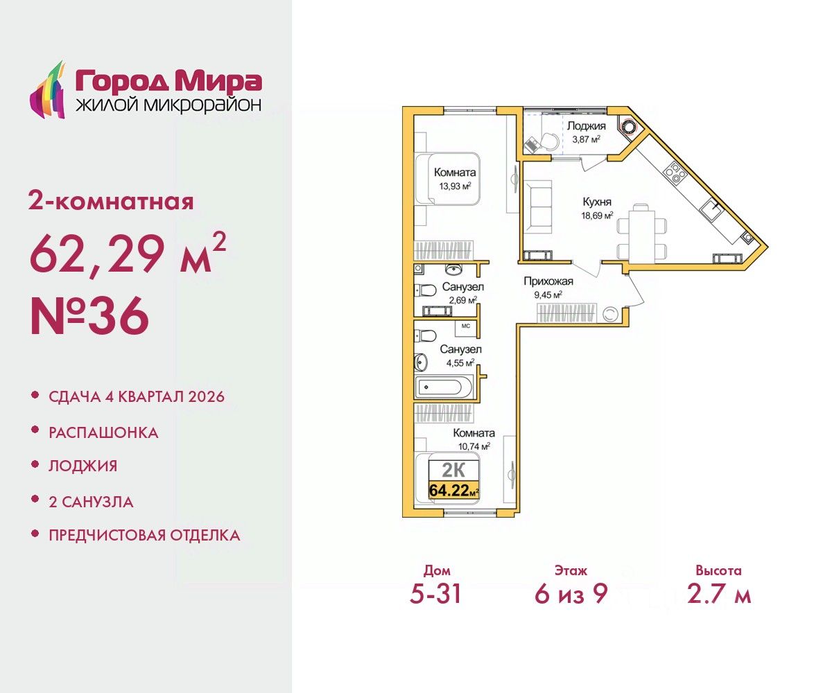 2-комн. квартира с предчистовой отделкой в ЖМ ''Город Мира'' на 6 этаже. Общая площадь: 62.29 кв.м., жилая: 24.67 кв.м., площадь просторной кухни-столовой: 18.69 кв.м. Квартира - распашонка, без проходных комнат, окна выходят на paзные стороны дома. В квартире одна лоджия, один совмещенный и один раздельный санузел. Высота потолков 2.7 м. Квартиры в ЖК ''Город Мира'' ваш комфорт начинается здесь! ''Город Мира'' это масштабный жилой комплекс, созданный для тех, кто ценит комфорт, безопасность и гармонию с природой. Здесь продумана каждая деталь: от удобной инфраструктуры до эргономичных планировок квартир. В 2024 году микрорайон ''Город Мира'' победил в номинации ''Лучший экологический проект года в сфере строительства'' по версии премии Crimea Urban Awards. Почему выбирают наш комплекс: - Зеленый оазис живите среди природы в черте города. - Всё под рукой 2 детских сада, магазины, фитнес, медицина. - Безопасность: закрытая территория с видеонаблюдением. Наши квартиры: - Просторные планировки с кладовыми. - Лоджии с остеклением. - Автономное отопление: платите только за реальное потребление. - Предчистовая отделка, включает стяжку пола, без штукатурки стен. - Консьерж-сервис и подземный паркинг. Инфраструктура комплекса: - Детские и спортивные площадки. - Зоны отдыха с беседками. - Фитнес-клубы и салоны красоты. - Будущая школа на территории, уже функционируют два детских сада. Выгодные условия покупки: - Ипотека от 5,5%, военная ипотека от 5,5%. - Рассрочка. - Материнский капитал на первоначальный взнос. Квартира находится в корпусе 5_31. Дом монолитный, одноподъездный, высотой 9 этажей. В подъезде 1 грузовой лифт. Окончание строительства - 4 квартал 2026 года. Оформление сделки по договору долевого участия. #26CcEm