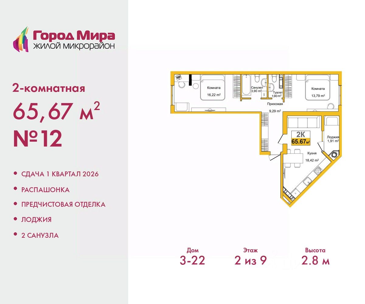 2-комн. квартира с предчистовой отделкой в ЖМ ''Город Мира'' на 2 этаже. Общая площадь: 65.67 кв.м., жилая: 30.01 кв.м., площадь просторной кухни-столовой: 18.42 кв.м. Квартира - распашонка, без проходных комнат, окна выходят на paзные стороны дома. В квартире одна лоджия, один совмещенный и один раздельный санузел. Высота потолков 2.8 м. Жилой комплекс ''Город Мира'' комфорт и гармония в современном формате. ''Город Мира'' это масштабный жилой комплекс, созданный для тех, кто ценит комфорт, безопасность и гармонию с природой. Здесь продумана каждая деталь от удобной инфраструктуры до эргономичных планировок квартир. В 2024 году микрорайон ''Город Мира'' победил в номинации ''Лучший экологический проект года в сфере строительства'' по версии премии Crimea Urban Awards. Ключевые преимущества комплекса: - удачное расположение зеленый район с благоприятным микроклиматом - продуманное зонирование жилые кварталы, зоны отдыха и коммерческие объекты - комфорт-класс высокое качество строительства и современные инженерные решения Инфраструктура ''Города Мира'': Образование и досуг: - 2 детских сада (по 260 мест каждый) - планируется строительство общеобразовательной школы - детские и спортивные площадки в каждом дворе - беседки для отдыха, зоны для выгула собак Ритейл и сервис: - магазины, аптеки, медицинские центры - фитнес-клубы, салоны красоты - детские развивающие центры Парковки: - гостевые парковки - наземные и подземные паркинги Квартиры с продуманным комфортом: - просторные планировки с кладовыми и колясочными - лоджии с остеклением - автономное отопление (по 23 дому: индивидуальное отопление) - выполнена стяжка пола (по 3, 4, 20, 21, 22 домам: выполненная стяжка пола и штукатурка стен) - Консьерж-сервис для дополнительного удобства Благоустройство территории: - ландшафтный дизайн с зонами отдыха - современные детские площадки - стильные холлы с дизайнерской отделкой - система видеонаблюдения для безопасности ''Город Мира'' это место, где созданы все условия для комфортной жизни. Выбирайте качество и продуманность в каждой детали! Квартира находится в корпусе 3_22. Дом монолитный, одноподъездный, высотой 9 этажей. В подъезде 1 грузовой лифт. Окончание строительства - 1 квартал 2026 года. Оформление сделки по договору долевого участия. #ZS5g75