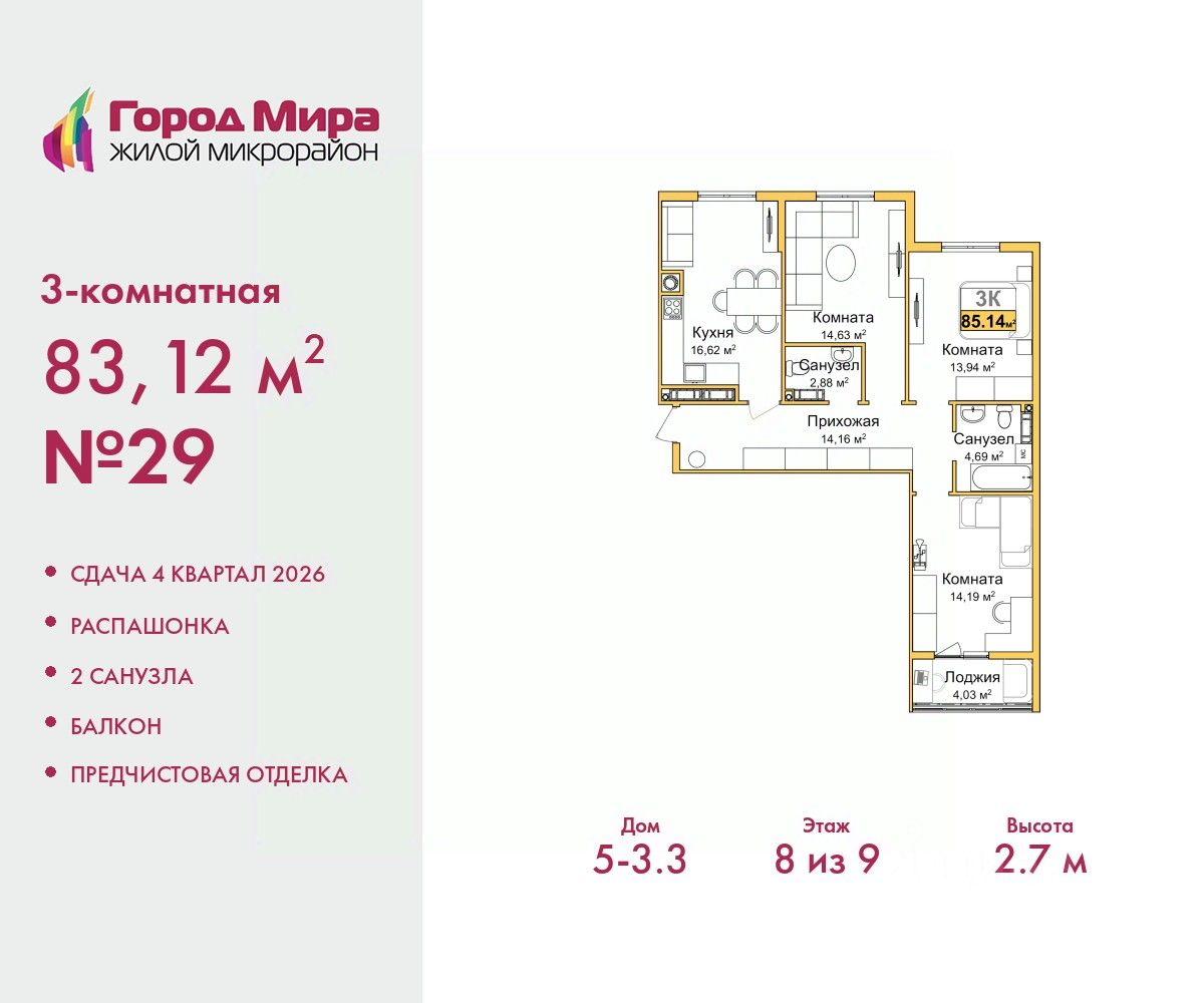 Просторная 3-комн. квартира с предчистовой отделкой в ЖМ ''Город Мира'' на 8 этаже. Общая площадь: 83.12 кв.м., жилая: 42.76 кв.м., площадь просторной кухни-столовой: 16.62 кв.м. Квартира - распашонка, без проходных комнат, окна выходят на paзные стороны дома. В квартире один балкон, один совмещенный и один раздельный санузел. Высота потолков 2.7 м. Квартиры в ЖК ''Город Мира'' ваш комфорт начинается здесь! ''Город Мира'' это масштабный жилой комплекс, созданный для тех, кто ценит комфорт, безопасность и гармонию с природой. Здесь продумана каждая деталь: от удобной инфраструктуры до эргономичных планировок квартир. В 2024 году микрорайон ''Город Мира'' победил в номинации ''Лучший экологический проект года в сфере строительства'' по версии премии Crimea Urban Awards. Почему выбирают наш комплекс: - Зеленый оазис живите среди природы в черте города. - Всё под рукой 2 детских сада, магазины, фитнес, медицина. - Безопасность: закрытая территория с видеонаблюдением. Наши квартиры: - Просторные планировки с кладовыми. - Лоджии с остеклением. - Автономное отопление: платите только за реальное потребление. - Предчистовая отделка, включает стяжку пола, без штукатурки стен. - Консьерж-сервис и подземный паркинг. Инфраструктура комплекса: - Детские и спортивные площадки. - Зоны отдыха с беседками. - Фитнес-клубы и салоны красоты. - Будущая школа на территории, уже функционируют два детских сада. Выгодные условия покупки: - Ипотека от 5,5%, военная ипотека от 5,5%. - Рассрочка. - Материнский капитал на первоначальный взнос. Квартира находится в корпусе 5_3.3. Дом монолитный, одноподъездный, высотой 9 этажей. В подъезде 1 грузовой лифт. Окончание строительства - 4 квартал 2026 года. Оформление сделки по договору долевого участия. #ZmglC0