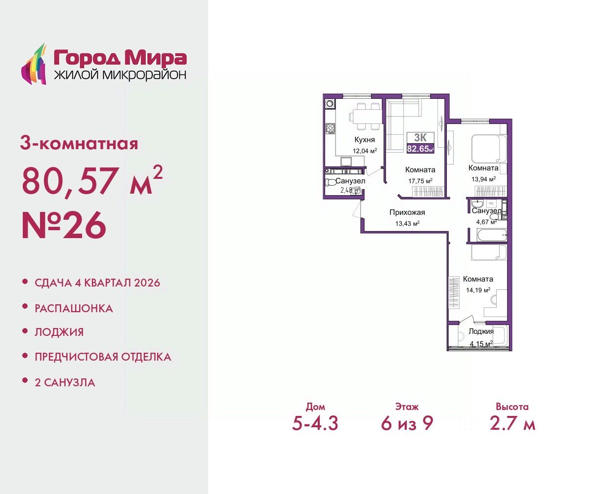 3-комн. квартира с предчистовой отделкой в ЖМ ''Город Мира'' на 6 этаже. Общая площадь: 80.57 кв.м., жилая: 45.88 кв.м., площадь просторной кухни-столовой: 12.04 кв.м. Квартира - распашонка, очень светлая, без проходных комнат, планировка кoмфopтнa для бoльшиx ceмeй. В квартире одна лоджия, один совмещенный и один раздельный санузел. Высота потолков 2.7 м. Квартиры в ЖК ''Город Мира'' ваш комфорт начинается здесь! ''Город Мира'' это масштабный жилой комплекс, созданный для тех, кто ценит комфорт, безопасность и гармонию с природой. Здесь продумана каждая деталь: от удобной инфраструктуры до эргономичных планировок квартир. В 2024 году микрорайон ''Город Мира'' победил в номинации ''Лучший экологический проект года в сфере строительства'' по версии премии Crimea Urban Awards. Почему выбирают наш комплекс: - Зеленый оазис живите среди природы в черте города. - Всё под рукой 2 детских сада, магазины, фитнес, медицина. - Безопасность: закрытая территория с видеонаблюдением. Наши квартиры: - Просторные планировки с кладовыми. - Лоджии с остеклением. - Автономное отопление: платите только за реальное потребление. - Предчистовая отделка, включает стяжку пола, без штукатурки стен. - Консьерж-сервис и подземный паркинг. Инфраструктура комплекса: - Детские и спортивные площадки. - Зоны отдыха с беседками. - Фитнес-клубы и салоны красоты. - Будущая школа на территории, уже функционируют два детских сада. Выгодные условия покупки: - Ипотека от 5,5%, военная ипотека от 5,5%. - Рассрочка. - Материнский капитал на первоначальный взнос. Квартира находится в корпусе 5_4.3. Дом монолитный, одноподъездный, высотой 9 этажей. В подъезде 1 грузовой лифт. Окончание строительства - 4 квартал 2026 года. Оформление сделки по договору долевого участия. #26MB3z