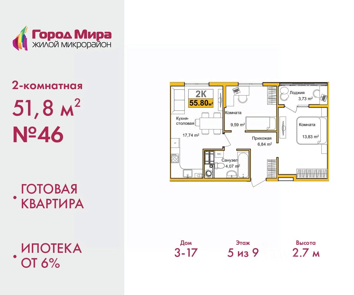 Готовые квартиры. Ипотека от 6%. Звоните, наши менеджеры вам все расскажут! Двухкомнатная квартира от застройщика с предчистовой отделкой в ЖМ ''Город Мира'' на 5 этаже. Общая площадь: 51.8 кв.м., жилая: 23.42 кв.м., площадь просторной кухни-столовой: 17.74 кв.м. Комнаты изолированные, все окна выходят на одну сторону. В квартире одна лоджия, один совмещенный санузел. Высота потолков 2.7 м. Жилой комплекс ''Город Мира'' комфорт и гармония в современном формате. ''Город Мира'' это масштабный жилой комплекс, созданный для тех, кто ценит комфорт, безопасность и гармонию с природой. Здесь продумана каждая деталь от удобной инфраструктуры до эргономичных планировок квартир. В 2024 году микрорайон ''Город Мира'' победил в номинации ''Лучший экологический проект года в сфере строительства'' по версии премии Crimea Urban Awards. Ключевые преимущества комплекса: - удачное расположение зеленый район с благоприятным микроклиматом - продуманное зонирование жилые кварталы, зоны отдыха и коммерческие объекты - комфорт-класс высокое качество строительства и современные инженерные решения Инфраструктура ''Города Мира'': Образование и досуг: - 2 детских сада (по 260 мест каждый) - планируется строительство общеобразовательной школы - детские и спортивные площадки в каждом дворе - беседки для отдыха, зоны для выгула собак Ритейл и сервис: - магазины, аптеки, медицинские центры - фитнес-клубы, салоны красоты - детские развивающие центры Парковки: - гостевые парковки - наземные и подземные паркинги Квартиры с продуманным комфортом: - просторные планировки с кладовыми и колясочными - лоджии с остеклением - автономное отопление (по 23 дому: индивидуальное отопление) - выполнена стяжка пола (по 3, 4, 20, 21, 22 домам: выполненная стяжка пола и штукатурка стен) - Консьерж-сервис для дополнительного удобства Благоустройство территории: - ландшафтный дизайн с зонами отдыха - современные детские площадки - стильные холлы с дизайнерской отделкой - система видеонаблюдения для безопасности ''Город Мира'' это место, где созданы все условия для комфортной жизни. Выбирайте качество и продуманность в каждой детали! Квартира находится в корпусе 3_17. Дом монолитный, одноподъездный, высотой 9 этажей. В подъезде 1 грузовой лифт. Строительство завершено, дом сдан в 4 квартале 2024 года. Оформление сделки по договору купли-продажи. #zm8fvD