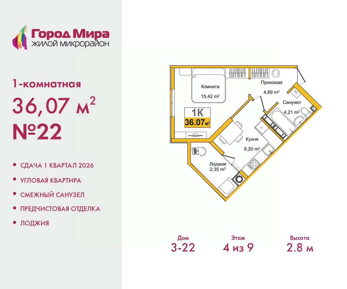1-комн. квартира с предчистовой отделкой в ЖМ ''Город Мира'' на 4 этаже. Общая площадь: 36.07 кв.м., жилая: 15.42 кв.м., площадь просторной кухни-столовой: 9.2 кв.м. Угловая квартира, идеально подойдет любителям тишины и панорамных видов. В квартире одна лоджия, один совмещенный санузел. Высота потолков 2.8 м. Жилой комплекс ''Город Мира'' комфорт и гармония в современном формате. ''Город Мира'' это масштабный жилой комплекс, созданный для тех, кто ценит комфорт, безопасность и гармонию с природой. Здесь продумана каждая деталь от удобной инфраструктуры до эргономичных планировок квартир. В 2024 году микрорайон ''Город Мира'' победил в номинации ''Лучший экологический проект года в сфере строительства'' по версии премии Crimea Urban Awards. Ключевые преимущества комплекса: - удачное расположение зеленый район с благоприятным микроклиматом - продуманное зонирование жилые кварталы, зоны отдыха и коммерческие объекты - комфорт-класс высокое качество строительства и современные инженерные решения Инфраструктура ''Города Мира'': Образование и досуг: - 2 детских сада (по 260 мест каждый) - планируется строительство общеобразовательной школы - детские и спортивные площадки в каждом дворе - беседки для отдыха, зоны для выгула собак Ритейл и сервис: - магазины, аптеки, медицинские центры - фитнес-клубы, салоны красоты - детские развивающие центры Парковки: - гостевые парковки - наземные и подземные паркинги Квартиры с продуманным комфортом: - просторные планировки с кладовыми и колясочными - лоджии с остеклением - автономное отопление (по 23 дому: индивидуальное отопление) - выполнена стяжка пола (по 3, 4, 20, 21, 22 домам: выполненная стяжка пола и штукатурка стен) - Консьерж-сервис для дополнительного удобства Благоустройство территории: - ландшафтный дизайн с зонами отдыха - современные детские площадки - стильные холлы с дизайнерской отделкой - система видеонаблюдения для безопасности ''Город Мира'' это место, где созданы все условия для комфортной жизни. Выбирайте качество и продуманность в каждой детали! Квартира находится в корпусе 3_22. Дом монолитный, одноподъездный, высотой 9 этажей. В подъезде 1 грузовой лифт. Окончание строительства - 1 квартал 2026 года. Оформление сделки по договору долевого участия. #zMvD4D