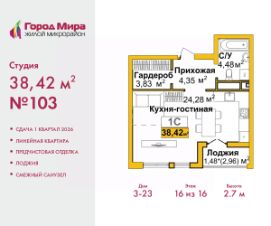 Однокомнатная квартира-студия от застройщика с предчистовой отделкой в ЖМ ''Город Мира'' на 16 этаже. Общая площадь: 38.42 кв.м., площадь гостиной 24.28 кв.м., из которых 5 кв.м. выделено под кухонную зону. Все окна выходят на одну сторону. В квартире одна лоджия, один совмещенный санузел. Высота потолков 2.7 м. Жилой комплекс ''Город Мира'' комфорт и гармония в современном формате. ''Город Мира'' это масштабный жилой комплекс, созданный для тех, кто ценит комфорт, безопасность и гармонию с природой. Здесь продумана каждая деталь от удобной инфраструктуры до эргономичных планировок квартир. В 2024 году микрорайон ''Город Мира'' победил в номинации ''Лучший экологический проект года в сфере строительства'' по версии премии Crimea Urban Awards. Ключевые преимущества комплекса:- удачное расположение зеленый район с благоприятным микроклиматом- продуманное зонирование жилые кварталы, зоны отдыха и коммерческие объекты- комфорт-класс высокое качество строительства и современные инженерные решения Инфраструктура ''Города Мира'': Образование и досуг:- 2 детских сада (по 260 мест каждый)- планируется строительство общеобразовательной школы- детские и спортивные площадки в каждом дворе- беседки для отдыха, зоны для выгула собак Ритейл и сервис:- магазины, аптеки, медицинские центры- фитнес-клубы, салоны красоты- детские развивающие центры Парковки:- гостевые парковки- наземные и подземные паркинги Квартиры с продуманным комфортом:- просторные планировки с кладовыми и колясочными- лоджии с остеклением- автономное отопление (по 23 дому: индивидуальное отопление)- выполнена стяжка пола (по 3, 4, 20, 21, 22 домам: выполненная стяжка пола и штукатурка стен) - Консьерж-сервис для дополнительного удобства Благоустройство территории:- ландшафтный дизайн с зонами отдыха- современные детские площадки- стильные холлы с дизайнерской отделкой- система видеонаблюдения для безопасности ''Город Мира'' это место, где созданы все условия для комфортной жизни. Выбирайте качество и продуманность в каждой детали! Квартира находится в корпусе 3_23. Дом монолитный, одноподъездный, высотой 16 этажей. В подъезде 1 пассажирский и 1 грузовой лифт. Окончание строительства - 1 квартал 2026 года. Оформление сделки по договору долевого участия. #2mA10A