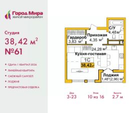 Просторная 1-комн. квартира-студия с предчистовой отделкой в ЖМ ''Город Мира'' на 10 этаже. Общая площадь: 38.42 кв.м., площадь гостиной 24.28 кв.м., из которых 5 кв.м. выделено под кухонную зону. Все окна выходят на одну сторону. В квартире одна лоджия, один совмещенный санузел. Высота потолков 2.7 м. Жилой комплекс ''Город Мира'' комфорт и гармония в современном формате. ''Город Мира'' это масштабный жилой комплекс, созданный для тех, кто ценит комфорт, безопасность и гармонию с природой. Здесь продумана каждая деталь от удобной инфраструктуры до эргономичных планировок квартир. В 2024 году микрорайон ''Город Мира'' победил в номинации ''Лучший экологический проект года в сфере строительства'' по версии премии Crimea Urban Awards. Ключевые преимущества комплекса:- удачное расположение зеленый район с благоприятным микроклиматом- продуманное зонирование жилые кварталы, зоны отдыха и коммерческие объекты- комфорт-класс высокое качество строительства и современные инженерные решения Инфраструктура ''Города Мира'': Образование и досуг:- 2 детских сада (по 260 мест каждый)- планируется строительство общеобразовательной школы- детские и спортивные площадки в каждом дворе- беседки для отдыха, зоны для выгула собак Ритейл и сервис:- магазины, аптеки, медицинские центры- фитнес-клубы, салоны красоты- детские развивающие центры Парковки:- гостевые парковки- наземные и подземные паркинги Квартиры с продуманным комфортом:- просторные планировки с кладовыми и колясочными- лоджии с остеклением- автономное отопление (по 23 дому: индивидуальное отопление)- выполнена стяжка пола (по 3, 4, 20, 21, 22 домам: выполненная стяжка пола и штукатурка стен) - Консьерж-сервис для дополнительного удобства Благоустройство территории:- ландшафтный дизайн с зонами отдыха- современные детские площадки- стильные холлы с дизайнерской отделкой- система видеонаблюдения для безопасности ''Город Мира'' это место, где созданы все условия для комфортной жизни. Выбирайте качество и продуманность в каждой детали! Квартира находится в корпусе 3_23. Дом монолитный, одноподъездный, высотой 16 этажей. В подъезде 1 пассажирский и 1 грузовой лифт. Окончание строительства - 1 квартал 2026 года. Оформление сделки по договору долевого участия. #zMsfDw