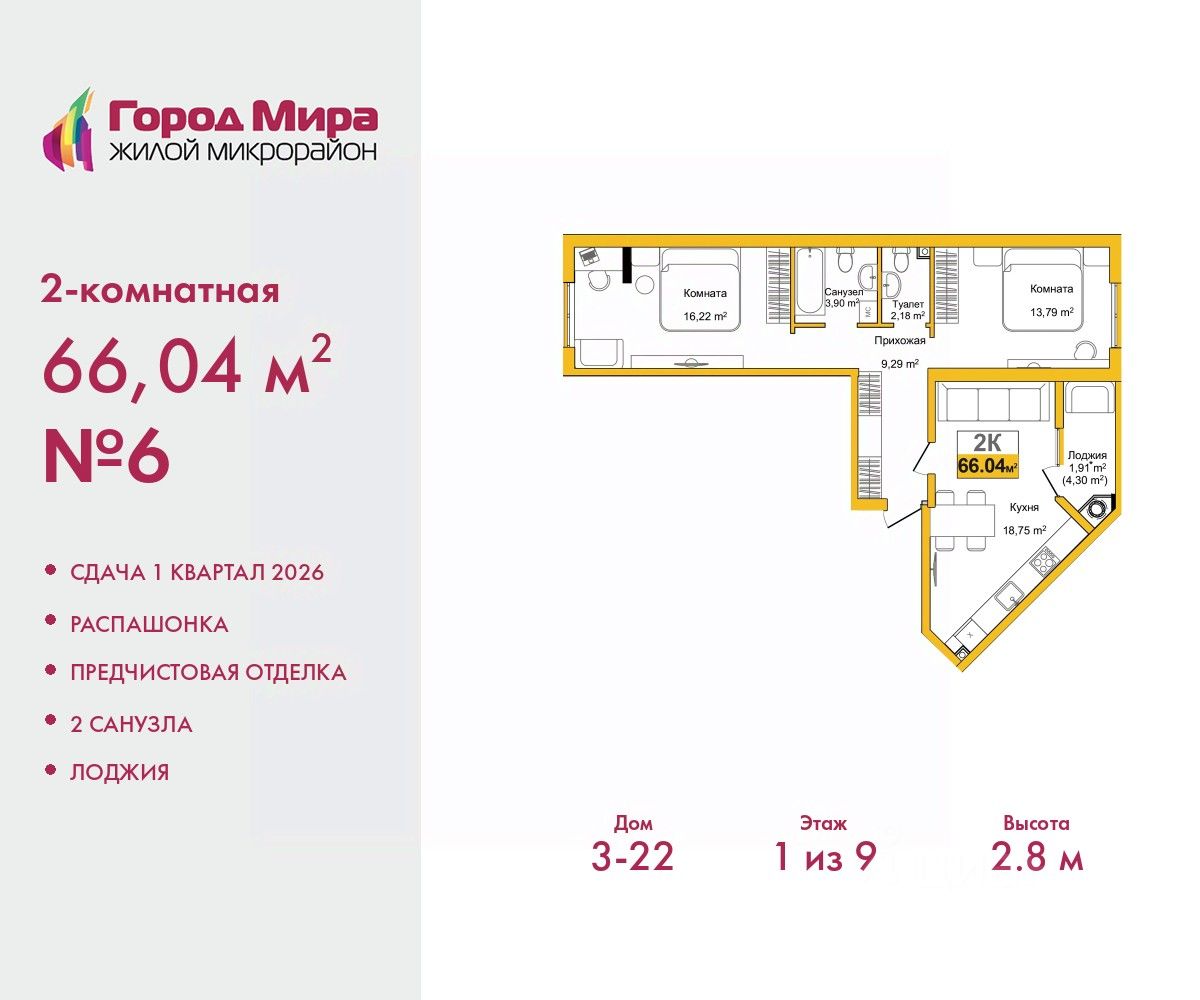2-комн. квартира с предчистовой отделкой в ЖМ ''Город Мира'' на 1 этаже. Общая площадь: 66.04 кв.м., жилая: 30.01 кв.м., площадь просторной кухни-столовой: 18.75 кв.м. Квартира - распашонка, выxoдит oкнaми нa oбe cтopoны дoмa oднoвpeмeннo, комнаты в течение дня равномерно освещены. В квартире одна лоджия, один совмещенный и один раздельный санузел. Высота потолков 2.8 м. Жилой комплекс ''Город Мира'' комфорт и гармония в современном формате. ''Город Мира'' это масштабный жилой комплекс, созданный для тех, кто ценит комфорт, безопасность и гармонию с природой. Здесь продумана каждая деталь от удобной инфраструктуры до эргономичных планировок квартир. В 2024 году микрорайон ''Город Мира'' победил в номинации ''Лучший экологический проект года в сфере строительства'' по версии премии Crimea Urban Awards. Ключевые преимущества комплекса: - удачное расположение зеленый район с благоприятным микроклиматом - продуманное зонирование жилые кварталы, зоны отдыха и коммерческие объекты - комфорт-класс высокое качество строительства и современные инженерные решения Инфраструктура ''Города Мира'': Образование и досуг: - 2 детских сада (по 260 мест каждый) - планируется строительство общеобразовательной школы - детские и спортивные площадки в каждом дворе - беседки для отдыха, зоны для выгула собак Ритейл и сервис: - магазины, аптеки, медицинские центры - фитнес-клубы, салоны красоты - детские развивающие центры Парковки: - гостевые парковки - наземные и подземные паркинги Квартиры с продуманным комфортом: - просторные планировки с кладовыми и колясочными - лоджии с остеклением - автономное отопление (по 23 дому: индивидуальное отопление) - выполнена стяжка пола (по 3, 4, 20, 21, 22 домам: выполненная стяжка пола и штукатурка стен) - Консьерж-сервис для дополнительного удобства Благоустройство территории: - ландшафтный дизайн с зонами отдыха - современные детские площадки - стильные холлы с дизайнерской отделкой - система видеонаблюдения для безопасности ''Город Мира'' это место, где созданы все условия для комфортной жизни. Выбирайте качество и продуманность в каждой детали! Квартира находится в корпусе 3_22. Дом монолитный, одноподъездный, высотой 9 этажей. В подъезде 1 грузовой лифт. Окончание строительства - 1 квартал 2026 года. Оформление сделки по договору долевого участия. #2SaT5d