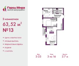 Успейте оформить бронирование, пока действует скидка! Период предложения ограничен! Стоимость квартиры указана со скидкой, ваша экономия составит 743,750 RUB. Звоните, наши менеджеры вам все расскажут! Просторная 2-комн. квартира с предчистовой отделкой в ЖМ ''Город Мира'' на 3 этаже. Общая площадь: 63.52 кв.м., жилая: 33.89 кв.м., площадь просторной кухни-столовой: 10.69 кв.м. Угловая квартира, идеально подойдет любителям тишины и панорамных видов. В квартире одна лоджия, один совмещенный и один раздельный санузел. Высота потолков 2.7 м. ''Город Мира'' это масштабный жилой комплекс, созданный для тех, кто ценит комфорт, безопасность и гармонию с природой. Здесь продумана каждая деталь от удобной инфраструктуры до эргономичных планировок квартир. Главные преимущества: Удачное расположение зеленый район с благоприятным микроклиматомПродуманное зонирование жилые кварталы, зоны отдыха и коммерческие объектыКомфорт-класс высокое качество строительства и современные инженерные решения Инфраструктура Города Мира: Образование и досуг:2 детских сада (по 260 мест каждый)Планируется строительство общеобразовательной школыДетские и спортивные площадки в каждом двореБеседки для отдыха, зоны для выгула собак Торговля и сервис:Магазины, аптеки, медицинские центрыФитнес-клубы, салоны красотыДетские развивающие центры Парковки:Гостевые парковкиНаземные и подземные паркинги Благоустройство территории:Ландшафтный дизайн с зонами отдыхаСовременные детские площадкиСтильные холлы с дизайнерской отделкойСистема видеонаблюдения для безопасности. Почему именно 23-й дом?Комфорт и планировки:• Просторные квартиры с двумя санузлами и гардеробными• Увеличенная площадь остекления — максимум света и воздуха• Индивидуальное отопление — комфорт в любое время года Эстетика и стиль:• Дизайнерские входные группы — стиль начинается с порога• Архитектурная подсветка фасада — дом, которым хочется гордиться• Панорамные виды на город и сосновый бор рядом Инфраструктура и удобство:• Консьерж-сервис — дополнительный уровень сервиса и безопасности• Колясочные• Выполнена стяжка пола и штукатурка стен• Центральная локация внутри микрорайона — тишина и доступность Жизнь внутри дома:• Двухэтажный стилобат с коммерцией: магазины, кафе, офисы, студии и даже школа танцев• Современный двор: детский игровой комплекс, зоны отдыха для взрослых, зарядка для электромобилей, зона wi-fi на улице Возможно приобретение в ипотеку по выгодным условиям:• ставка — от 6% годовых• первоначальный взнос — от 20%• срок — до 30 лет• можно использовать материнский капитал даже на первый взнос. Также доступны военная и IT-ипотекаРассрочка от застройщика:• первый взнос от 30%,• равномерные платежи до окончания строительства. Квартира находится в корпусе 3_23. Дом монолитный, одноподъездный, высотой 16 этажей. В подъезде 1 пассажирский и 1 грузовой лифт. Окончание строительства - 4 квартал 2025 года. Оформление сделки по договору долево