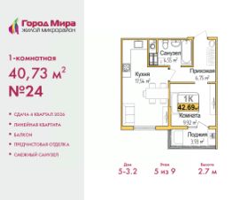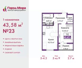 Просторная 1-комн. квартира с предчистовой отделкой в ЖМ ''Город Мира'' на 5 этаже. Общая площадь: 43.11 кв.м., жилая: 12.26 кв.м., площадь просторной кухни-столовой: 16.55 кв.м. Все окна выходят на одну сторону. В квартире одна лоджия, один совмещенный санузел. Высота потолков 2.7 м. Жилой комплекс ''Город Мира'' комфорт и гармония в современном формате. ''Город Мира'' это масштабный жилой комплекс, созданный для тех, кто ценит комфорт, безопасность и гармонию с природой. Здесь продумана каждая деталь от удобной инфраструктуры до эргономичных планировок квартир. В 2024 году микрорайон ''Город Мира'' победил в номинации ''Лучший экологический проект года в сфере строительства'' по версии премии Crimea Urban Awards. Ключевые преимущества комплекса:- удачное расположение зеленый район с благоприятным микроклиматом- продуманное зонирование жилые кварталы, зоны отдыха и коммерческие объекты- комфорт-класс высокое качество строительства и современные инженерные решения Инфраструктура ''Города Мира'': Образование и досуг:- 2 детских сада (по 260 мест каждый)- планируется строительство общеобразовательной школы- детские и спортивные площадки в каждом дворе- беседки для отдыха, зоны для выгула собак Ритейл и сервис:- магазины, аптеки, медицинские центры- фитнес-клубы, салоны красоты- детские развивающие центры Парковки:- гостевые парковки- наземные и подземные паркинги Квартиры с продуманным комфортом:- просторные планировки с кладовыми и колясочными- лоджии с остеклением- автономное отопление (по 23 дому: индивидуальное отопление)- выполнена стяжка пола (по 3, 4, 20, 21, 22 домам: выполненная стяжка пола и штукатурка стен) - Консьерж-сервис для дополнительного удобства Благоустройство территории:- ландшафтный дизайн с зонами отдыха- современные детские площадки- стильные холлы с дизайнерской отделкой- система видеонаблюдения для безопасности ''Город Мира'' это место, где созданы все условия для комфортной жизни. Выбирайте качество и продуманность в каждой детали! Квартира находится в корпусе 3_21. Дом монолитный, одноподъездный, высотой 9 этажей. В подъезде 1 грузовой лифт. Окончание строительства - 1 квартал 2026 года. Оформление сделки по договору долевого участия. #zmvdWc