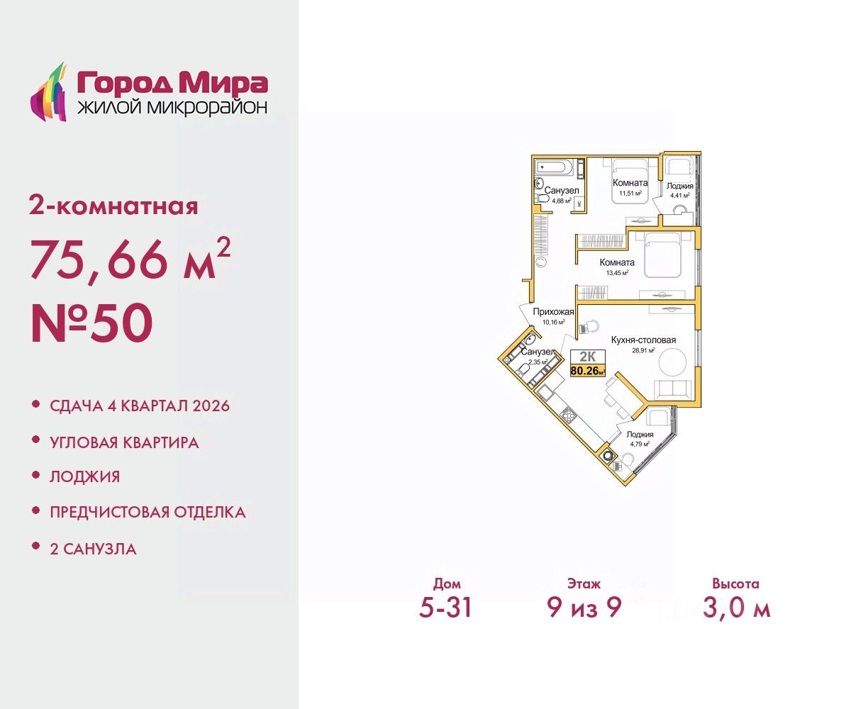 Продается 2-комн. квартира от застройщика с предчистовой отделкой в ЖМ ''Город Мира'' на 9 этаже. Общая площадь: 75.66 кв.м., жилая: 24.96 кв.м., площадь просторной кухни-столовой: 28.91 кв.м. Угловая квартира, идеально подойдет любителям тишины и панорамных видов. В квартире две лоджии, один совмещенный и один раздельный санузел. Высота потолков 3,0 м. Квартиры в ЖК ''Город Мира'' ваш комфорт начинается здесь! ''Город Мира'' это масштабный жилой комплекс, созданный для тех, кто ценит комфорт, безопасность и гармонию с природой. Здесь продумана каждая деталь: от удобной инфраструктуры до эргономичных планировок квартир. В 2024 году микрорайон ''Город Мира'' победил в номинации ''Лучший экологический проект года в сфере строительства'' по версии премии Crimea Urban Awards. Почему выбирают наш комплекс: - Зеленый оазис живите среди природы в черте города. - Всё под рукой 2 детских сада, магазины, фитнес, медицина. - Безопасность: закрытая территория с видеонаблюдением. Наши квартиры: - Просторные планировки с кладовыми. - Лоджии с остеклением. - Автономное отопление: платите только за реальное потребление. - Предчистовая отделка, включает стяжку пола, без штукатурки стен. - Консьерж-сервис и подземный паркинг. Инфраструктура комплекса: - Детские и спортивные площадки. - Зоны отдыха с беседками. - Фитнес-клубы и салоны красоты. - Будущая школа на территории, уже функционируют два детских сада. Выгодные условия покупки: - Ипотека от 5,5%, военная ипотека от 5,5%. - Рассрочка. - Материнский капитал на первоначальный взнос. Квартира находится в корпусе 5_31. Дом монолитный, одноподъездный, высотой 9 этажей. В подъезде 1 грузовой лифт. Окончание строительства - 4 квартал 2026 года. Оформление сделки по договору долевого участия. #Z5Sg9l
