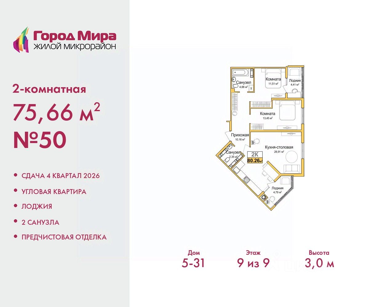 Просторная 2-комн. квартира с предчистовой отделкой в ЖМ ''Город Мира'' на 9 этаже. Общая площадь: 75.66 кв.м., жилая: 24.96 кв.м., площадь просторной кухни-столовой: 28.91 кв.м. Квартира угловая, идеально подойдет любителям тишины и панорамных видов. В квартире две лоджии, один совмещенный и один раздельный санузел. Высота потолков 3,0 м. Квартиры в ЖК ''Город Мира'' ваш комфорт начинается здесь! ''Город Мира'' это масштабный жилой комплекс, созданный для тех, кто ценит комфорт, безопасность и гармонию с природой. Здесь продумана каждая деталь: от удобной инфраструктуры до эргономичных планировок квартир. В 2024 году микрорайон ''Город Мира'' победил в номинации ''Лучший экологический проект года в сфере строительства'' по версии премии Crimea Urban Awards. Почему выбирают наш комплекс: - Зеленый оазис живите среди природы в черте города. - Всё под рукой 2 детских сада, магазины, фитнес, медицина. - Безопасность: закрытая территория с видеонаблюдением. Наши квартиры: - Просторные планировки с кладовыми. - Лоджии с остеклением. - Автономное отопление: платите только за реальное потребление. - Предчистовая отделка, включает стяжку пола, без штукатурки стен. - Консьерж-сервис и подземный паркинг. Инфраструктура комплекса: - Детские и спортивные площадки. - Зоны отдыха с беседками. - Фитнес-клубы и салоны красоты. - Будущая школа на территории, уже функционируют два детских сада. Выгодные условия покупки: - Ипотека от 5,5%, военная ипотека от 5,5%. - Рассрочка. - Материнский капитал на первоначальный взнос. Квартира находится в корпусе 5_31. Дом монолитный, одноподъездный, высотой 9 этажей. В подъезде 1 грузовой лифт. Окончание строительства - 4 квартал 2026 года. Оформление сделки по договору долевого участия. #2559gl