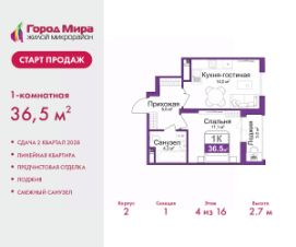Цена посчитана с учётом скидки 3% при полной оплате или ипотеке. Информация по телефону, наши менеджеры вам все расскажут. Просторная 1-комн. квартира с предчистовой отделкой в ЖМ ''Город Мира'' на 4 этаже. Общая площадь: 36.5 кв.м., жилая: 11.1 кв.м., площадь просторной кухни-столовой: 14 кв.м. Все окна выходят на одну сторону. В квартире одна лоджия, один совмещенный санузел. Высота потолков 2.7 м. ''Город Мира'' это масштабный жилой комплекс, созданный для тех, кто ценит комфорт, безопасность и гармонию с природой. Здесь продумана каждая деталь от удобной инфраструктуры до эргономичных планировок квартир. ''Город Мира'' победил в номинации ''Лучший экологический проект года в сфере строительства'' по версии премии Сrimеа Urbаn Аwаrds. Способы приобретения недвижимости в ''Городе Мира'':1. Ипотека: семейная от 5,5%, военная, IT-ипотека, базовая ипотечная программа и комбо-ипотека. Одобрение заявки проходит сразу в отделе продаж. 2. Материнский капитал на первый взнос.3. Рассрочка от застройщика - до июня 2028 года! Первоначальный взнос от 30%.4. Военная ипотека. Участники НИС могут приобрести квартиры по спец.цене. Ключевые преимущества комплекса:удачное расположение зеленый район с благоприятным микроклиматомпродуманное зонирование жилые кварталы, зоны отдыха и коммерческие объектыкомфорт-класс высокое качество строительства и современные инженерные решения Почему дом повышенной комфортности 2 в ''Городе Мира'' это лучшее решение? Образование и досуг: 2 детских сада (по 260 мест каждый) планируется строительство общеобразовательной школы детские и спортивные площадки в каждом дворе беседки для отдыха, зоны для выгула собак Ритейл и сервис: магазины, аптеки, медицинские центры фитнес-клубы, салоны красоты детские развивающие центры Парковки: гостевые парковки наземные и подземные паркинги Квартиры с продуманным комфортом: просторные планировки с кладовыми и колясочными лоджии с остеклением лапомойки для питомцев на первых этажах домов индивидуальное отопление выполнена стяжка пола и штукатурка стен консьерж-сервис для дополнительного удобства Благоустройство территории: ландшафтный дизайн с зонами отдыха современные детские площадки стильные холлы с дизайнерской отделкой система видеонаблюдения для безопасности ''Город Мира'' это место, где созданы все условия для комфортной жизни. Выбирайте качество и продуманность в каждой детали! Квартира находится во доме повышенной комфортности 2, 4-я очередь. Дом монолитно-каркасный, одноподъездный, высотой 16 этажей. В подъезде 1 пассажирский и 1 грузовой лифт. Окончание строительства - 2 квартал 2028 года. Оформление сделки по договору долевого участия. Квартира находится в корпусе 2. Дом монолитный, одноподъездный, высотой 16 этажей. На этаже 7 квартир. В подъезде 1 пассажирский и 1 грузовой лифт. Окончание строительства - 2 квартал 2028 года. Оформление сделки по договору долевого участия. #z6EZ9I