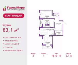 Цена посчитана с учётом скидки 3% при полной оплате или ипотеке. Звоните, мы вам все подробно расскажем. Просторная 3-комн. квартира с европланировкой и предчистовой отделкой в ЖМ ''Город Мира'' на 16 этаже. Общая площадь: 83.1 кв.м., жилая: 41.3 кв.м., суммарная площадь гостиной-столовой с кухонной зоной: 28.3 кв.м. Европланировка, за счет большой площади кухни-гостиной квартира выглядит просторной и очень удобна для жизни. Угловая квартира, очень светлая, естественная вентиляция при открытии окон. В квартире один балкон и одна лоджия, один совмещенный и один раздельный санузел. Высота потолков 2.7 м. ''Город Мира'' это масштабный жилой комплекс, созданный для тех, кто ценит комфорт, безопасность и гармонию с природой. Здесь продумана каждая деталь от удобной инфраструктуры до эргономичных планировок квартир. ''Город Мира'' победил в номинации ''Лучший экологический проект года в сфере строительства'' по версии премии Сrimеа Urbаn Аwаrds. Способы приобретения недвижимости в ''Городе Мира'':1. Ипотека: семейная от 5,5%, военная, IT-ипотека, базовая ипотечная программа и комбо-ипотека. Одобрение заявки проходит сразу в отделе продаж. 2. Материнский капитал на первый взнос.3. Рассрочка от застройщика - до июня 2028 года! Первоначальный взнос от 30%.4. Военная ипотека. Участники НИС могут приобрести квартиры по спец.цене. Ключевые преимущества комплекса:удачное расположение зеленый район с благоприятным микроклиматомпродуманное зонирование жилые кварталы, зоны отдыха и коммерческие объектыкомфорт-класс высокое качество строительства и современные инженерные решения Почему дом повышенной комфортности 2 в ''Городе Мира'' это лучшее решение? Образование и досуг: 2 детских сада (по 260 мест каждый) планируется строительство общеобразовательной школы детские и спортивные площадки в каждом дворе беседки для отдыха, зоны для выгула собак Ритейл и сервис: магазины, аптеки, медицинские центры фитнес-клубы, салоны красоты детские развивающие центры Парковки: гостевые парковки наземные и подземные паркинги Квартиры с продуманным комфортом: просторные планировки с кладовыми и колясочными лоджии с остеклением лапомойки для питомцев на первых этажах домов индивидуальное отопление выполнена стяжка пола и штукатурка стен консьерж-сервис для дополнительного удобства Благоустройство территории: ландшафтный дизайн с зонами отдыха современные детские площадки стильные холлы с дизайнерской отделкой система видеонаблюдения для безопасности ''Город Мира'' это место, где созданы все условия для комфортной жизни. Выбирайте качество и продуманность в каждой детали! Квартира находится во доме повышенной комфортности 2, 4-я очередь. Дом монолитно-каркасный, одноподъездный, высотой 16 этажей. В подъезде 1 пассажирский и 1 грузовой лифт. Окончание строительства - 2 квартал 2028 года. Оформление сделки по договору долевого участия. Квартира находится в корпусе 2. Дом монолитный, одноподъездный, высотой 16 этажей. На эт