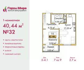 Просторная однокомнатная квартира с предчистовой отделкой в ЖМ ''Город Мира'' на 7 этаже. Общая площадь: 40.44 кв.м., жилая: 9.92 кв.м., площадь просторной кухни-столовой: 17.25 кв.м. Все окна выходят на одну сторону. В квартире один балкон, один совмещенный санузел. Высота потолков 2.7 м. Квартиры в ЖК ''Город Мира'' ваш комфорт начинается здесь! ''Город Мира'' это масштабный жилой комплекс, созданный для тех, кто ценит комфорт, безопасность и гармонию с природой. Здесь продумана каждая деталь: от удобной инфраструктуры до эргономичных планировок квартир. В 2024 году микрорайон ''Город Мира'' победил в номинации ''Лучший экологический проект года в сфере строительства'' по версии премии Crimea Urban Awards. Почему выбирают наш комплекс: - Зеленый оазис живите среди природы в черте города.- Всё под рукой 2 детских сада, магазины, фитнес, медицина. - Безопасность: закрытая территория с видеонаблюдением. Наши квартиры: - Просторные планировки с кладовыми. - Лоджии с остеклением.- Автономное отопление: платите только за реальное потребление. - Предчистовая отделка, включает стяжку пола, без штукатурки стен.- Консьерж-сервис и подземный паркинг. Инфраструктура комплекса: - Детские и спортивные площадки. - Зоны отдыха с беседками. - Фитнес-клубы и салоны красоты. - Будущая школа на территории, уже функционируют два детских сада. Выгодные условия покупки: - Ипотека от 5,5%, военная ипотека от 5,5%. - Рассрочка. - Материнский капитал на первоначальный взнос. Квартира находится в корпусе 5_4.1. Дом монолитный, одноподъездный, высотой 9 этажей. В подъезде 1 грузовой лифт. Окончание строительства - 4 квартал 2026 года. Оформление сделки по договору долевого участия. #zMBDcO