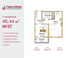 Продается однокомнатная квартира с предчистовой отделкой в ЖМ ''Город Мира'' на 8 этаже. Общая площадь: 40.44 кв.м., жилая: 9.92 кв.м., площадь просторной кухни-столовой: 17.25 кв.м. Все окна выходят на одну сторону. В квартире один балкон, один совмещенный санузел. Высота потолков 2.7 м. Квартиры в ЖК ''Город Мира'' ваш комфорт начинается здесь! ''Город Мира'' это масштабный жилой комплекс, созданный для тех, кто ценит комфорт, безопасность и гармонию с природой. Здесь продумана каждая деталь: от удобной инфраструктуры до эргономичных планировок квартир. В 2024 году микрорайон ''Город Мира'' победил в номинации ''Лучший экологический проект года в сфере строительства'' по версии премии Crimea Urban Awards. Почему выбирают наш комплекс: - Зеленый оазис живите среди природы в черте города.- Всё под рукой 2 детских сада, магазины, фитнес, медицина. - Безопасность: закрытая территория с видеонаблюдением. Наши квартиры: - Просторные планировки с кладовыми. - Лоджии с остеклением.- Автономное отопление: платите только за реальное потребление. - Предчистовая отделка, включает стяжку пола, без штукатурки стен. - Консьерж-сервис и подземный паркинг. Инфраструктура комплекса: - Детские и спортивные площадки. - Зоны отдыха с беседками. - Фитнес-клубы и салоны красоты. - Будущая школа на территории, уже функционируют два детских сада. Выгодные условия покупки: - Ипотека от 5,5%, военная ипотека от 5,5%. - Рассрочка. - Материнский капитал на первоначальный взнос. Квартира находится в корпусе 5_3.4. Дом монолитный, одноподъездный, высотой 9 этажей. В подъезде 1 грузовой лифт. Окончание строительства - 4 квартал 2026 года. Оформление сделки по договору долевого участия. #ZMbDBD