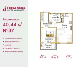 1-комн. квартира с предчистовой отделкой в ЖМ ''Город Мира'' на 8 этаже. Общая площадь: 40.44 кв.м., жилая: 9.92 кв.м., площадь просторной кухни-столовой: 17.25 кв.м. Все окна выходят на одну сторону. В квартире один балкон, один совмещенный санузел. Высота потолков 2.7 м. Квартиры в ЖК ''Город Мира'' ваш комфорт начинается здесь! ''Город Мира'' это масштабный жилой комплекс, созданный для тех, кто ценит комфорт, безопасность и гармонию с природой. Здесь продумана каждая деталь: от удобной инфраструктуры до эргономичных планировок квартир. В 2024 году микрорайон ''Город Мира'' победил в номинации ''Лучший экологический проект года в сфере строительства'' по версии премии Crimea Urban Awards. Почему выбирают наш комплекс: - Зеленый оазис живите среди природы в черте города.- Всё под рукой 2 детских сада, магазины, фитнес, медицина. - Безопасность: закрытая территория с видеонаблюдением. Наши квартиры: - Просторные планировки с кладовыми. - Лоджии с остеклением.- Автономное отопление: платите только за реальное потребление. - Предчистовая отделка, включает стяжку пола, без штукатурки стен. - Консьерж-сервис и подземный паркинг. Инфраструктура комплекса: - Детские и спортивные площадки. - Зоны отдыха с беседками. - Фитнес-клубы и салоны красоты. - Будущая школа на территории, уже функционируют два детских сада. Выгодные условия покупки: - Ипотека от 5,5%, военная ипотека от 5,5%. - Рассрочка. - Материнский капитал на первоначальный взнос. Квартира находится в корпусе 5_3.4. Дом монолитный, одноподъездный, высотой 9 этажей. В подъезде 1 грузовой лифт. Окончание строительства - 4 квартал 2026 года. Оформление сделки по договору долевого участия. #2MbdbD