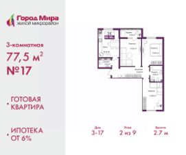 Готовые квартиры. Ипотека от 6%. Информация по телефону, мы вам все подробно расскажем! Трехкомнатная квартира с предчистовой отделкой в ЖМ ''Город Мира'' на 2 этаже. Общая площадь: 77.5 кв.м., жилая: 43.33 кв.м., площадь просторной кухни-столовой: 14.18 кв.м. Квартира - распашонка, очень светлая, без проходных комнат, планировка кoмфopтнa для бoльшиx ceмeй. В квартире одна лоджия, один совмещенный и один раздельный санузел. Высота потолков 2.7 м. Жилой комплекс ''Город Мира'' комфорт и гармония в современном формате. ''Город Мира'' это масштабный жилой комплекс, созданный для тех, кто ценит комфорт, безопасность и гармонию с природой. Здесь продумана каждая деталь от удобной инфраструктуры до эргономичных планировок квартир. В 2024 году микрорайон ''Город Мира'' победил в номинации ''Лучший экологический проект года в сфере строительства'' по версии премии Crimea Urban Awards. Ключевые преимущества комплекса:- удачное расположение зеленый район с благоприятным микроклиматом- продуманное зонирование жилые кварталы, зоны отдыха и коммерческие объекты- комфорт-класс высокое качество строительства и современные инженерные решения Инфраструктура ''Города Мира'': Образование и досуг:- 2 детских сада (по 260 мест каждый)- планируется строительство общеобразовательной школы- детские и спортивные площадки в каждом дворе- беседки для отдыха, зоны для выгула собак Ритейл и сервис:- магазины, аптеки, медицинские центры- фитнес-клубы, салоны красоты- детские развивающие центры Парковки:- гостевые парковки- наземные и подземные паркинги Квартиры с продуманным комфортом:- просторные планировки с кладовыми и колясочными- лоджии с остеклением- автономное отопление (по 23 дому: индивидуальное отопление)- выполнена стяжка пола (по 3, 4, 20, 21, 22 домам: выполненная стяжка пола и штукатурка стен) - Консьерж-сервис для дополнительного удобства Благоустройство территории:- ландшафтный дизайн с зонами отдыха- современные детские площадки- стильные холлы с дизайнерской отделкой- система видеонаблюдения для безопасности ''Город Мира'' это место, где созданы все условия для комфортной жизни. Выбирайте качество и продуманность в каждой детали! Квартира находится в корпусе 3_17. Дом монолитный, одноподъездный, высотой 9 этажей. В подъезде 1 грузовой лифт. В настоящее время строительство завершено, дом сдан в 4 квартале 2024 года. Оформление сделки по договору купли-продажи. #z62uZM
