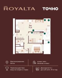 ЖК Скай Плаза 4.0 11-этажный новострой класса ''элит'' на побережье Черного моря. Для людей, желающих инвестировать в своё будущее, лучшее решение - это вложить средства в покупку недвижимости в ЖК ''Скай Плаза 4.0''. По типу конструкции здание представляет собой монолитный блок, возводимый по современным технологиям. Здание имеет волнообразный фасад, отличается в целом привлекательным внешним видом и спокойным интерьером внутри. Как для постоянных, так и для временных жильцов здесь предусмотрены комфортабельные условия пребывания. Комплекс располагается на первой линии моря, откуда к обустроенному чистому пляжу не более 10 м. На самом верхнем этаже предусмотрены пентхаусы. Здание будет отапливаться при помощи индивидуальной крышной газовой котельной. Для стоянки машин предусмотрен двухуровневый подземный паркинг, располагающихся на двух этажах. Богатая инфраструктура района способствует комфортному пребыванию жильцов как временного, так и постоянного размещения. Поблизости расположены рестораны, аптека, есть тренажерные залы и аквапарк. В получасовой доступности знаменитая Ялтинская набережная, где в летний вечер можно ощутить всю прелесть крымского променада.