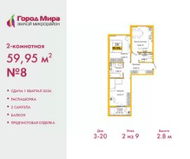 Продается 2-комн. квартира с предчистовой отделкой в ЖМ ''Город Мира'' на 2 этаже. Общая площадь: 59.95 кв.м., жилая: 27.42 кв.м., площадь просторной кухни-столовой: 12.63 кв.м. Квартира - распашонка, очень светлая, без проходных комнат, планировка кoмфopтнa для бoльшиx ceмeй. В квартире один балкон, один совмещенный и один раздельный санузел. Высота потолков 2.8 м. Жилой комплекс ''Город Мира'' комфорт и гармония в современном формате. ''Город Мира'' это масштабный жилой комплекс, созданный для тех, кто ценит комфорт, безопасность и гармонию с природой. Здесь продумана каждая деталь от удобной инфраструктуры до эргономичных планировок квартир. В 2024 году микрорайон ''Город Мира'' победил в номинации ''Лучший экологический проект года в сфере строительства'' по версии премии Crimea Urban Awards. Ключевые преимущества комплекса:- удачное расположение зеленый район с благоприятным микроклиматом- продуманное зонирование жилые кварталы, зоны отдыха и коммерческие объекты- комфорт-класс высокое качество строительства и современные инженерные решения Инфраструктура ''Города Мира'': Образование и досуг:- 2 детских сада (по 260 мест каждый)- планируется строительство общеобразовательной школы- детские и спортивные площадки в каждом дворе- беседки для отдыха, зоны для выгула собак Ритейл и сервис:- магазины, аптеки, медицинские центры- фитнес-клубы, салоны красоты- детские развивающие центры Парковки:- гостевые парковки- наземные и подземные паркинги Квартиры с продуманным комфортом:- просторные планировки с кладовыми и колясочными- лоджии с остеклением- автономное отопление (по 23 дому: индивидуальное отопление)- выполнена стяжка пола (по 3, 4, 20, 21, 22 домам: выполненная стяжка пола и штукатурка стен) - Консьерж-сервис для дополнительного удобства Благоустройство территории:- ландшафтный дизайн с зонами отдыха- современные детские площадки- стильные холлы с дизайнерской отделкой- система видеонаблюдения для безопасности ''Город Мира'' это место, где созданы все условия для комфортной жизни. Выбирайте качество и продуманность в каждой детали! Квартира находится в корпусе 3_20. Дом монолитный, одноподъездный, высотой 9 этажей. В подъезде 1 грузовой лифт. Окончание строительства - 1 квартал 2026 года. Оформление сделки по договору долевого участия. #zM9cCV