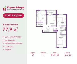 Цена посчитана с учётом скидки 3% при полной оплате или ипотеке. Звоните, наши менеджеры вам все расскажут. Продается 3-комн. квартира с предчистовой отделкой в ЖМ ''Город Мира'' на 8 этаже. Общая площадь: 77.9 кв.м., жилая: 41.28 кв.м., площадь просторной кухни-столовой: 12.04 кв.м. Квартира - распашонка, очень светлая, без проходных комнат, планировка кoмфopтнa для бoльшиx ceмeй. В квартире одна лоджия, один совмещенный и один раздельный санузел. Высота потолков 2.7 м. ''Город Мира'' это масштабный жилой комплекс, созданный для тех, кто ценит комфорт, безопасность и гармонию с природой. Здесь продумана каждая деталь от удобной инфраструктуры до эргономичных планировок квартир. ''Город Мира'' победил в номинации ''Лучший экологический проект года в сфере строительства'' по версии премии Сrimеа Urbаn Аwаrds. Способы приобретения недвижимости в ''Городе Мира'':1. Ипотека: семейная от 5,5%, военная, IT-ипотека, базовая ипотечная программа и комбо-ипотека. Одобрение заявки проходит сразу в отделе продаж. 2. Материнский капитал на первый взнос.3. Рассрочка от застройщика - до июня 2028 года! Первоначальный взнос от 30%.4. Военная ипотека. Участники НИС могут приобрести квартиры по спец.цене. Ключевые преимущества комплекса:удачное расположение зеленый район с благоприятным микроклиматомпродуманное зонирование жилые кварталы, зоны отдыха и коммерческие объектыкомфорт-класс высокое качество строительства и современные инженерные решения Почему дом повышенной комфортности 2 в ''Городе Мира'' это лучшее решение? Образование и досуг: 2 детских сада (по 260 мест каждый) планируется строительство общеобразовательной школы детские и спортивные площадки в каждом дворе беседки для отдыха, зоны для выгула собак Ритейл и сервис: магазины, аптеки, медицинские центры фитнес-клубы, салоны красоты детские развивающие центры Парковки: гостевые парковки наземные и подземные паркинги Квартиры с продуманным комфортом: просторные планировки с кладовыми и колясочными лоджии с остеклением лапомойки для питомцев на первых этажах домов индивидуальное отопление выполнена стяжка пола и штукатурка стен консьерж-сервис для дополнительного удобства Благоустройство территории: ландшафтный дизайн с зонами отдыха современные детские площадки стильные холлы с дизайнерской отделкой система видеонаблюдения для безопасности ''Город Мира'' это место, где созданы все условия для комфортной жизни. Выбирайте качество и продуманность в каждой детали! Квартира находится во доме повышенной комфортности 2, 4-я очередь. Дом монолитно-каркасный, одноподъездный, высотой 16 этажей. В подъезде 1 пассажирский и 1 грузовой лифт. Окончание строительства - 2 квартал 2028 года. Оформление сделки по договору долевого участия. Квартира находится в корпусе 2. Дом монолитный, одноподъездный, высотой 16 этажей. На этаже 7 квартир. В подъезде 1 пассажирский и 1 грузовой лифт. Окончание строительства - 2 квартал 2028 года. Оформление сделки по догово