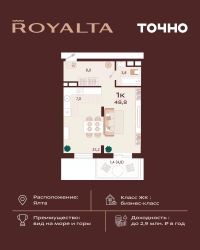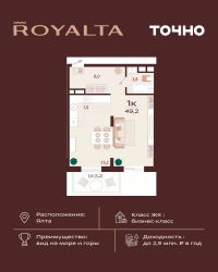 Жилой комплекс ''РОЯЛТА'' включает 5 монолитно-кирпичных девятиэтажных зданий. Проект предлагает квартиры различных планировок: от однокомнатных до трехкомнатных с расширенными балконами и террасами до 13,4 м2. Территория будет благоустроена детскими игровыми и спортивными площадками, гостевой автостоянкой и озеленением, включая газоны, деревья и кустарники. Также появятся современные уличные тренажёры, СПА-комплекс и панорамный инфинити-бассейн. В шаговой доступности находятся центральная набережная Ялты, детские сады, школы, супермаркеты, торговые центры, Ялтинский медицинский колледж, автовокзал и Мордвиновский парк.