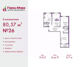 Просторная 3-комн. квартира с предчистовой отделкой в ЖМ ''Город Мира'' на 6 этаже. Общая площадь: 80.57 кв.м., жилая: 45.88 кв.м., площадь просторной кухни-столовой: 12.04 кв.м. Квартира - распашонка, без проходных комнат, окна выходят на paзные стороны дома. В квартире одна лоджия, один совмещенный и один раздельный санузел. Высота потолков 2.7 м. Квартиры в ЖК ''Город Мира'' ваш комфорт начинается здесь! ''Город Мира'' это масштабный жилой комплекс, созданный для тех, кто ценит комфорт, безопасность и гармонию с природой. Здесь продумана каждая деталь: от удобной инфраструктуры до эргономичных планировок квартир. В 2024 году микрорайон ''Город Мира'' победил в номинации ''Лучший экологический проект года в сфере строительства'' по версии премии Crimea Urban Awards. Почему выбирают наш комплекс: - Зеленый оазис живите среди природы в черте города.- Всё под рукой 2 детских сада, магазины, фитнес, медицина. - Безопасность: закрытая территория с видеонаблюдением. Наши квартиры: - Просторные планировки с кладовыми. - Лоджии с остеклением.- Автономное отопление: платите только за реальное потребление. - Предчистовая отделка, включает стяжку пола, без штукатурки стен. - Консьерж-сервис и подземный паркинг. Инфраструктура комплекса: - Детские и спортивные площадки. - Зоны отдыха с беседками. - Фитнес-клубы и салоны красоты. - Будущая школа на территории, уже функционируют два детских сада. Выгодные условия покупки: - Ипотека от 5,5%, военная ипотека от 5,5%. - Рассрочка. - Материнский капитал на первоначальный взнос. Квартира находится в корпусе 5_4.3. Дом монолитный, одноподъездный, высотой 9 этажей. В подъезде 1 грузовой лифт. Окончание строительства - 4 квартал 2026 года. Оформление сделки по договору долевого участия. #ZmmBuZ