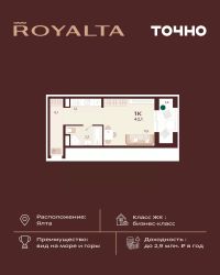 Продаётся 1-комнатная квартира в строящемся доме (Корпус 2), срок сдачи: II-кв. 2027, общей площадью 44.9 кв.м., на 5 этаже. Жилой комплекс бизнес-класса ''РОЯЛТА'' от застройщика ''ГК ТОЧНО'' в городе Ялта Республики Крым на улице Спендиарова.