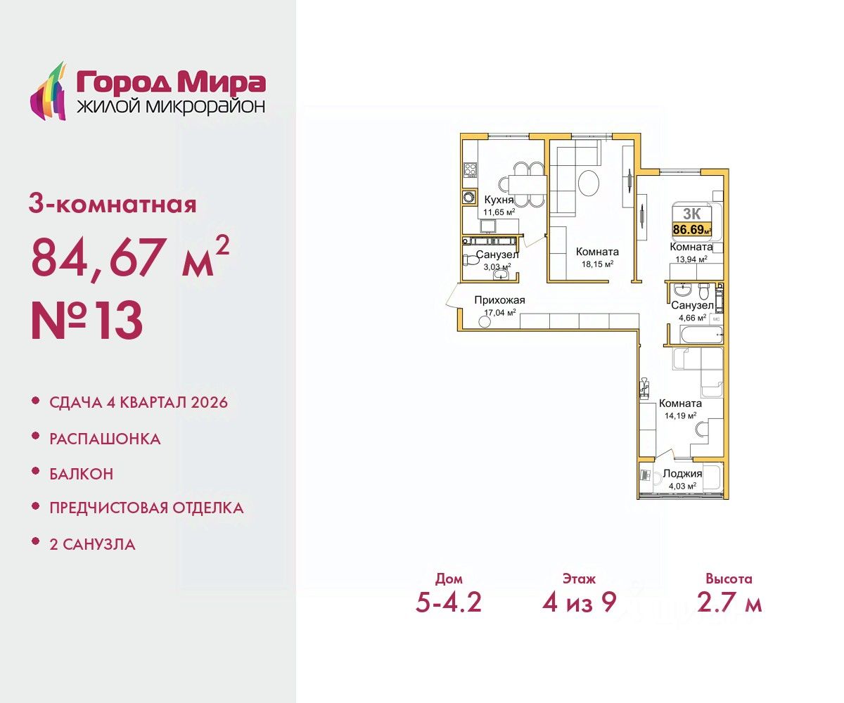 Трехкомнатная квартира с предчистовой отделкой в ЖМ ''Город Мира'' на 4 этаже. Общая площадь: 84.67 кв.м., жилая: 46.28 кв.м., площадь просторной кухни-столовой: 11.65 кв.м. Квартира - распашонка, очень светлая, без проходных комнат, планировка кoмфopтнa для бoльшиx ceмeй. В квартире один балкон, один совмещенный и один раздельный санузел. Высота потолков 2.7 м. Квартиры в ЖК ''Город Мира'' ваш комфорт начинается здесь! ''Город Мира'' это масштабный жилой комплекс, созданный для тех, кто ценит комфорт, безопасность и гармонию с природой. Здесь продумана каждая деталь: от удобной инфраструктуры до эргономичных планировок квартир. В 2024 году микрорайон ''Город Мира'' победил в номинации ''Лучший экологический проект года в сфере строительства'' по версии премии Crimea Urban Awards. Почему выбирают наш комплекс: - Зеленый оазис живите среди природы в черте города. - Всё под рукой 2 детских сада, магазины, фитнес, медицина. - Безопасность: закрытая территория с видеонаблюдением. Наши квартиры: - Просторные планировки с кладовыми. - Лоджии с остеклением. - Автономное отопление: платите только за реальное потребление. - Предчистовая отделка, включает стяжку пола, без штукатурки стен. - Консьерж-сервис и подземный паркинг. Инфраструктура комплекса: - Детские и спортивные площадки. - Зоны отдыха с беседками. - Фитнес-клубы и салоны красоты. - Будущая школа на территории, уже функционируют два детских сада. Выгодные условия покупки: - Ипотека от 5,5%, военная ипотека от 5,5%. - Рассрочка. - Материнский капитал на первоначальный взнос. Квартира находится в корпусе 5_4.2. Дом монолитный, одноподъездный, высотой 9 этажей. В подъезде 1 грузовой лифт. Окончание строительства - 4 квартал 2026 года. Оформление сделки по договору долевого участия. #zssgAi