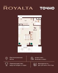 Жилой комплекс ''РОЯЛТА'' включает 5 монолитно-кирпичных девятиэтажных зданий. Проект предлагает квартиры различных планировок: от однокомнатных до трехкомнатных с расширенными балконами и террасами до 13,4 м2. Территория будет благоустроена детскими игровыми и спортивными площадками, гостевой автостоянкой и озеленением, включая газоны, деревья и кустарники. Также появятся современные уличные тренажёры, СПА-комплекс и панорамный инфинити-бассейн. В шаговой доступности находятся центральная набережная Ялты, детские сады, школы, супермаркеты, торговые центры, Ялтинский медицинский колледж, автовокзал и Мордвиновский парк.