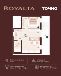 Жилой комплекс ''РОЯЛТА'' включает 5 монолитно-кирпичных девятиэтажных зданий. Проект предлагает квартиры различных планировок: от однокомнатных до трехкомнатных с расширенными балконами и террасами до 13,4 м2. Территория будет благоустроена детскими игровыми и спортивными площадками, гостевой автостоянкой и озеленением, включая газоны, деревья и кустарники. Также появятся современные уличные тренажёры, СПА-комплекс и панорамный инфинити-бассейн. В шаговой доступности находятся центральная набережная Ялты, детские сады, школы, супермаркеты, торговые центры, Ялтинский медицинский колледж, автовокзал и Мордвиновский парк.