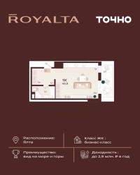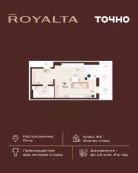 Жилой комплекс ''РОЯЛТА'' включает 5 монолитно-кирпичных девятиэтажных зданий. Проект предлагает квартиры различных планировок: от однокомнатных до трехкомнатных с расширенными балконами и террасами до 13,4 м2. Территория будет благоустроена детскими игровыми и спортивными площадками, гостевой автостоянкой и озеленением, включая газоны, деревья и кустарники. Также появятся современные уличные тренажёры, СПА-комплекс и панорамный инфинити-бассейн. В шаговой доступности находятся центральная набережная Ялты, детские сады, школы, супермаркеты, торговые центры, Ялтинский медицинский колледж, автовокзал и Мордвиновский парк.