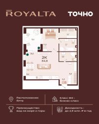 Продаётся 2-комнатная квартира в строящемся доме (Корпус 2), срок сдачи: II-кв. 2027, общей площадью 84.8 кв.м., на 1 этаже. Жилой комплекс бизнес-класса ''РОЯЛТА'' от застройщика ''ГК ТОЧНО'' в городе Ялта Республики Крым на улице Спендиарова.