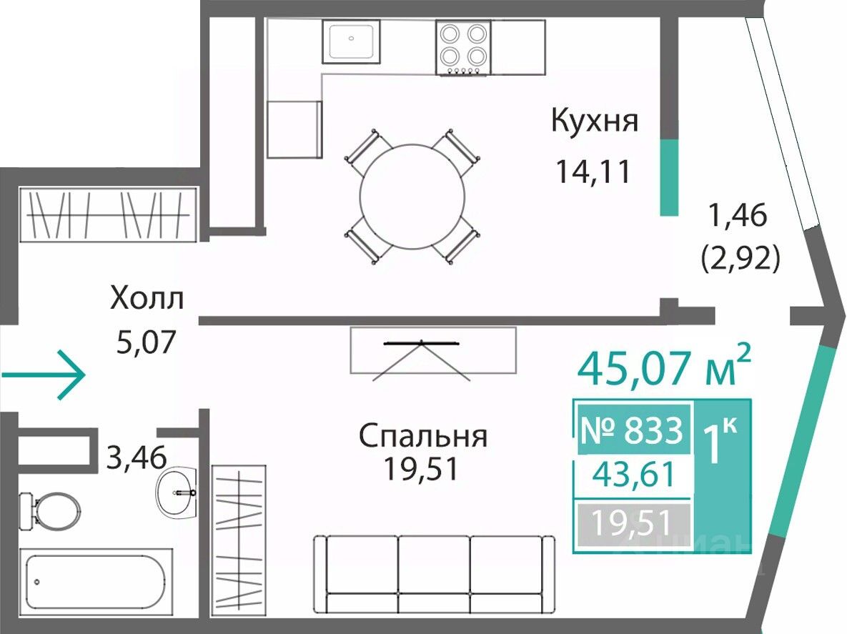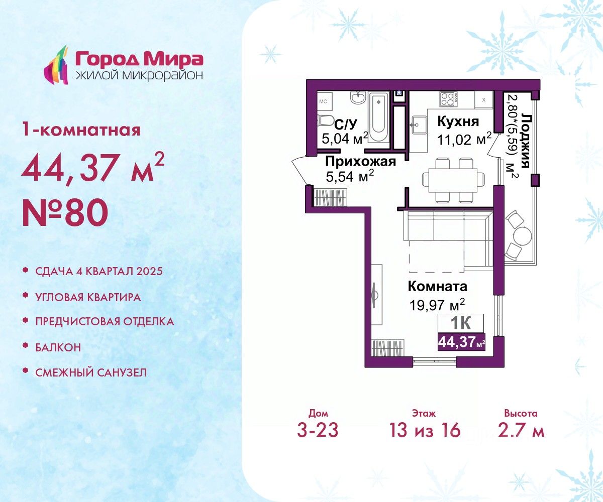 Просторная 1-комн. квартира с предчистовой отделкой в ЖМ ''Город Мира'' на 13 этаже. Общая площадь: 44.37 кв.м., жилая: 19.97 кв.м., площадь просторной кухни-столовой: 11.02 кв.м. Угловая квартира, очень светлая, естественная вентиляция при открытии окон. В квартире один балкон, один совмещенный санузел. Высота потолков 2.7 м. ''Город Мира'' это масштабный жилой комплекс, созданный для тех, кто ценит комфорт, безопасность и гармонию с природой. Здесь продумана каждая деталь от удобной инфраструктуры до эргономичных планировок квартир. Главные преимущества: Удачное расположение зеленый район с благоприятным микроклиматом Продуманное зонирование жилые кварталы, зоны отдыха и коммерческие объекты Комфорт-класс высокое качество строительства и современные инженерные решения Инфраструктура Города Мира: Образование и досуг: 2 детских сада (по 260 мест каждый) Планируется строительство общеобразовательной школы Детские и спортивные площадки в каждом дворе Беседки для отдыха, зоны для выгула собак Торговля и сервис: Магазины, аптеки, медицинские центры Фитнес-клубы, салоны красоты Детские развивающие центры Парковки: Гостевые парковки Наземные и подземные паркинги Благоустройство территории: Ландшафтный дизайн с зонами отдыха Современные детские площадки Стильные холлы с дизайнерской отделкой Система видеонаблюдения для безопасности. Почему именно 23-й дом? Комфорт и планировки: • Просторные квартиры с двумя санузлами и гардеробными • Увеличенная площадь остекления — максимум света и воздуха • Индивидуальное отопление — комфорт в любое время года Эстетика и стиль: • Дизайнерские входные группы — стиль начинается с порога • Архитектурная подсветка фасада — дом, которым хочется гордиться • Панорамные виды на город и сосновый бор рядом Инфраструктура и удобство: • Консьерж-сервис — дополнительный уровень сервиса и безопасности • Колясочные • Выполнена стяжка пола и штукатурка стен • Центральная локация внутри микрорайона — тишина и доступность Жизнь внутри дома: • Двухэтажный стилобат с коммерцией: магазины, кафе, офисы, студии и даже школа танцев • Современный двор: детский игровой комплекс, зоны отдыха для взрослых, зарядка для электромобилей, зона wi-fi на улице Возможно приобретение в ипотеку по выгодным условиям: • ставка — от 6% годовых • первоначальный взнос — от 20% • срок — до 30 лет • можно использовать материнский капитал даже на первый взнос. Также доступны военная и IT-ипотека Рассрочка от застройщика: • первый взнос от 30%, • равномерные платежи до окончания строительства. Квартира находится в корпусе 3_23. Дом монолитный, одноподъездный, высотой 16 этажей. В подъезде 1 пассажирский и 1 грузовой лифт. Окончание строительства - 4 квартал 2025 года. Оформление сделки по договору долевого участия. #Zs59vt