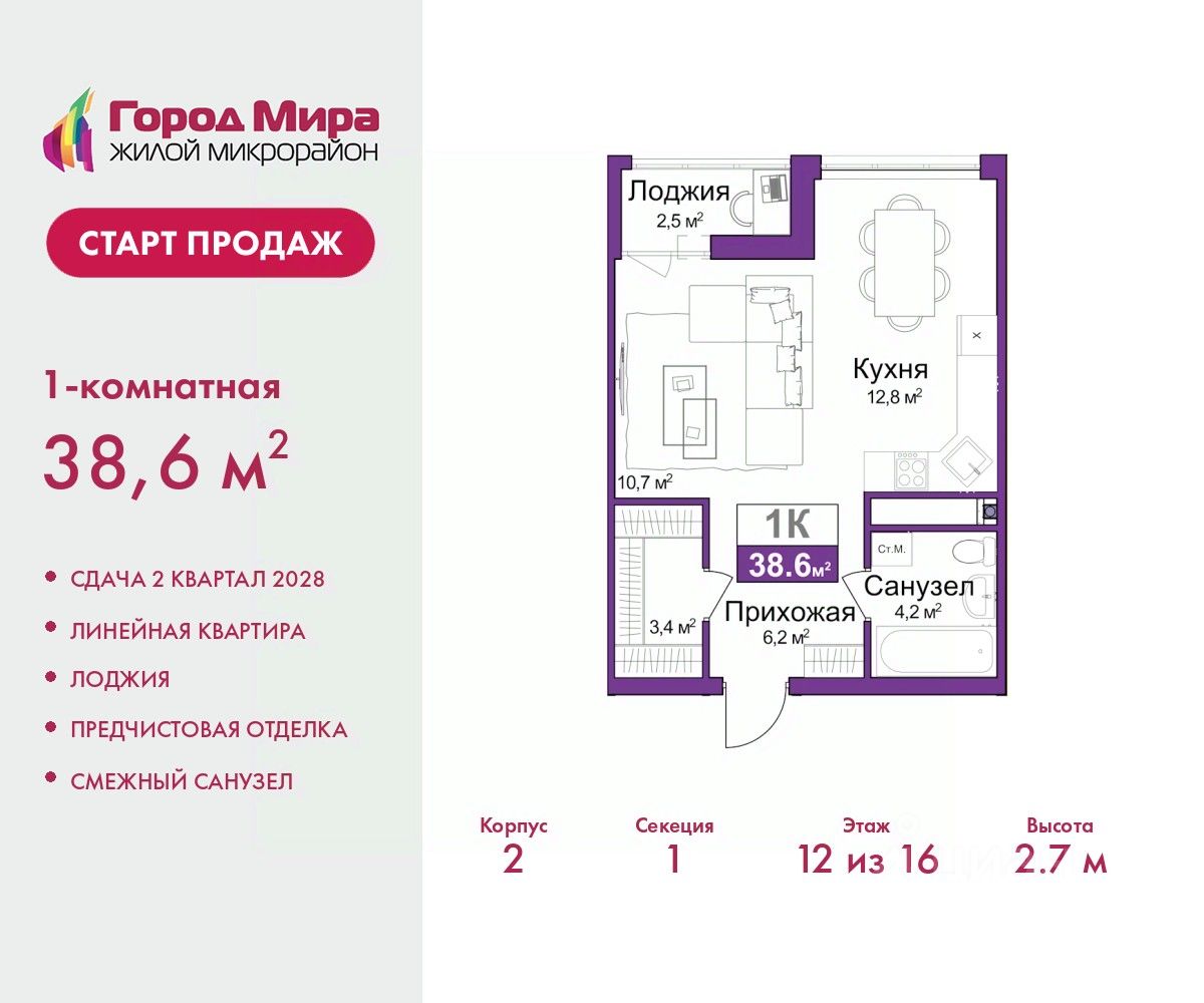 Цена посчитана с учётом скидки 3% при полной оплате или ипотеке. Звоните, наши менеджеры вам все расскажут. Однокомнатная квартира с предчистовой отделкой в ЖМ ''Город Мира'' на 12 этаже. Общая площадь: 38.6 кв.м., жилая: 10.7 кв.м., площадь просторной кухни-столовой: 12.8 кв.м. Все окна выходят на одну сторону. В квартире одна лоджия, один совмещенный санузел. Высота потолков 2.7 м. ''Город Мира'' это масштабный жилой комплекс, созданный для тех, кто ценит комфорт, безопасность и гармонию с природой. Здесь продумана каждая деталь от удобной инфраструктуры до эргономичных планировок квартир. ''Город Мира'' победил в номинации ''Лучший экологический проект года в сфере строительства'' по версии премии Сrimеа Urbаn Аwаrds. Способы приобретения недвижимости в ''Городе Мира'': 1. Ипотека: семейная от 5,5%, военная, IT-ипотека, базовая ипотечная программа и комбо-ипотека. Одобрение заявки проходит сразу в отделе продаж. 2. Материнский капитал на первый взнос. 3. Рассрочка от застройщика - до июня 2028 года! Первоначальный взнос от 30%. 4. Военная ипотека. Участники НИС могут приобрести квартиры по спец.цене. Ключевые преимущества комплекса: удачное расположение зеленый район с благоприятным микроклиматом продуманное зонирование жилые кварталы, зоны отдыха и коммерческие объекты комфорт-класс высокое качество строительства и современные инженерные решения Почему дом повышенной комфортности 2 в ''Городе Мира'' это лучшее решение? Образование и досуг: 2 детских сада (по 260 мест каждый) планируется строительство общеобразовательной школы детские и спортивные площадки в каждом дворе беседки для отдыха, зоны для выгула собак Ритейл и сервис: магазины, аптеки, медицинские центры фитнес-клубы, салоны красоты детские развивающие центры Парковки: гостевые парковки наземные и подземные паркинги Квартиры с продуманным комфортом: просторные планировки с кладовыми и колясочными лоджии с остеклением лапомойки для питомцев на первых этажах домов индивидуальное отопление выполнена стяжка пола и штукатурка стен консьерж-сервис для дополнительного удобства Благоустройство территории: ландшафтный дизайн с зонами отдыха современные детские площадки стильные холлы с дизайнерской отделкой система видеонаблюдения для безопасности ''Город Мира'' это место, где созданы все условия для комфортной жизни. Выбирайте качество и продуманность в каждой детали! Квартира находится во доме повышенной комфортности 2, 4-я очередь. Дом монолитно-каркасный, одноподъездный, высотой 16 этажей. В подъезде 1 пассажирский и 1 грузовой лифт. Окончание строительства - 2 квартал 2028 года. Оформление сделки по договору долевого участия. Квартира находится в корпусе 2. Дом монолитный, одноподъездный, высотой 16 этажей. На этаже 7 квартир. В подъезде 1 пассажирский и 1 грузовой лифт. Окончание строительства - 2 квартал 2028 года. Оформление сделки по договору долевого участия. #z6eZ9z
