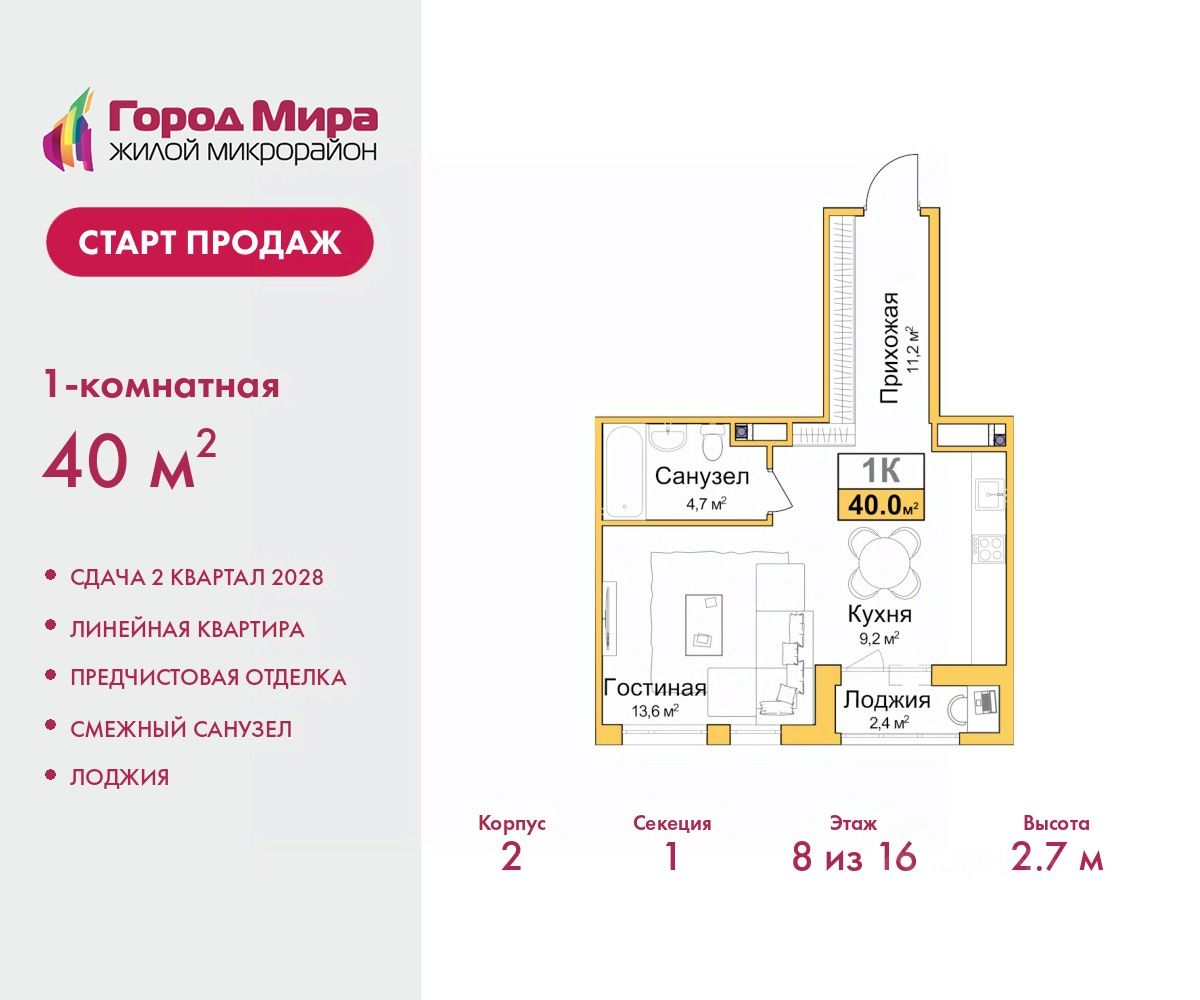 Цена посчитана с учётом скидки 3% при полной оплате или ипотеке. Звоните, наши менеджеры вам все расскажут. Продается однокомнатная квартира с предчистовой отделкой в ЖМ ''Город Мира'' на 8 этаже. Общая площадь: 40 кв.м., жилая: 13.6 кв.м., площадь просторной кухни-столовой: 9.2 кв.м. Все окна выходят на одну сторону. В квартире одна лоджия, один совмещенный санузел. Высота потолков 2.7 м. ''Город Мира'' это масштабный жилой комплекс, созданный для тех, кто ценит комфорт, безопасность и гармонию с природой. Здесь продумана каждая деталь от удобной инфраструктуры до эргономичных планировок квартир. ''Город Мира'' победил в номинации ''Лучший экологический проект года в сфере строительства'' по версии премии Сrimеа Urbаn Аwаrds. Способы приобретения недвижимости в ''Городе Мира'': 1. Ипотека: семейная от 5,5%, военная, IT-ипотека, базовая ипотечная программа и комбо-ипотека. Одобрение заявки проходит сразу в отделе продаж. 2. Материнский капитал на первый взнос. 3. Рассрочка от застройщика - до июня 2028 года! Первоначальный взнос от 30%. 4. Военная ипотека. Участники НИС могут приобрести квартиры по спец.цене. Ключевые преимущества комплекса: удачное расположение зеленый район с благоприятным микроклиматом продуманное зонирование жилые кварталы, зоны отдыха и коммерческие объекты комфорт-класс высокое качество строительства и современные инженерные решения Почему дом повышенной комфортности 2 в ''Городе Мира'' это лучшее решение? Образование и досуг: 2 детских сада (по 260 мест каждый) планируется строительство общеобразовательной школы детские и спортивные площадки в каждом дворе беседки для отдыха, зоны для выгула собак Ритейл и сервис: магазины, аптеки, медицинские центры фитнес-клубы, салоны красоты детские развивающие центры Парковки: гостевые парковки наземные и подземные паркинги Квартиры с продуманным комфортом: просторные планировки с кладовыми и колясочными лоджии с остеклением лапомойки для питомцев на первых этажах домов индивидуальное отопление выполнена стяжка пола и штукатурка стен консьерж-сервис для дополнительного удобства Благоустройство территории: ландшафтный дизайн с зонами отдыха современные детские площадки стильные холлы с дизайнерской отделкой система видеонаблюдения для безопасности ''Город Мира'' это место, где созданы все условия для комфортной жизни. Выбирайте качество и продуманность в каждой детали! Квартира находится во доме повышенной комфортности 2, 4-я очередь. Дом монолитно-каркасный, одноподъездный, высотой 16 этажей. В подъезде 1 пассажирский и 1 грузовой лифт. Окончание строительства - 2 квартал 2028 года. Оформление сделки по договору долевого участия. Квартира находится в корпусе 2. Дом монолитный, одноподъездный, высотой 16 этажей. На этаже 7 квартир. В подъезде 1 пассажирский и 1 грузовой лифт. Окончание строительства - 2 квартал 2028 года. Оформление сделки по договору долевого участия. #2meZg3