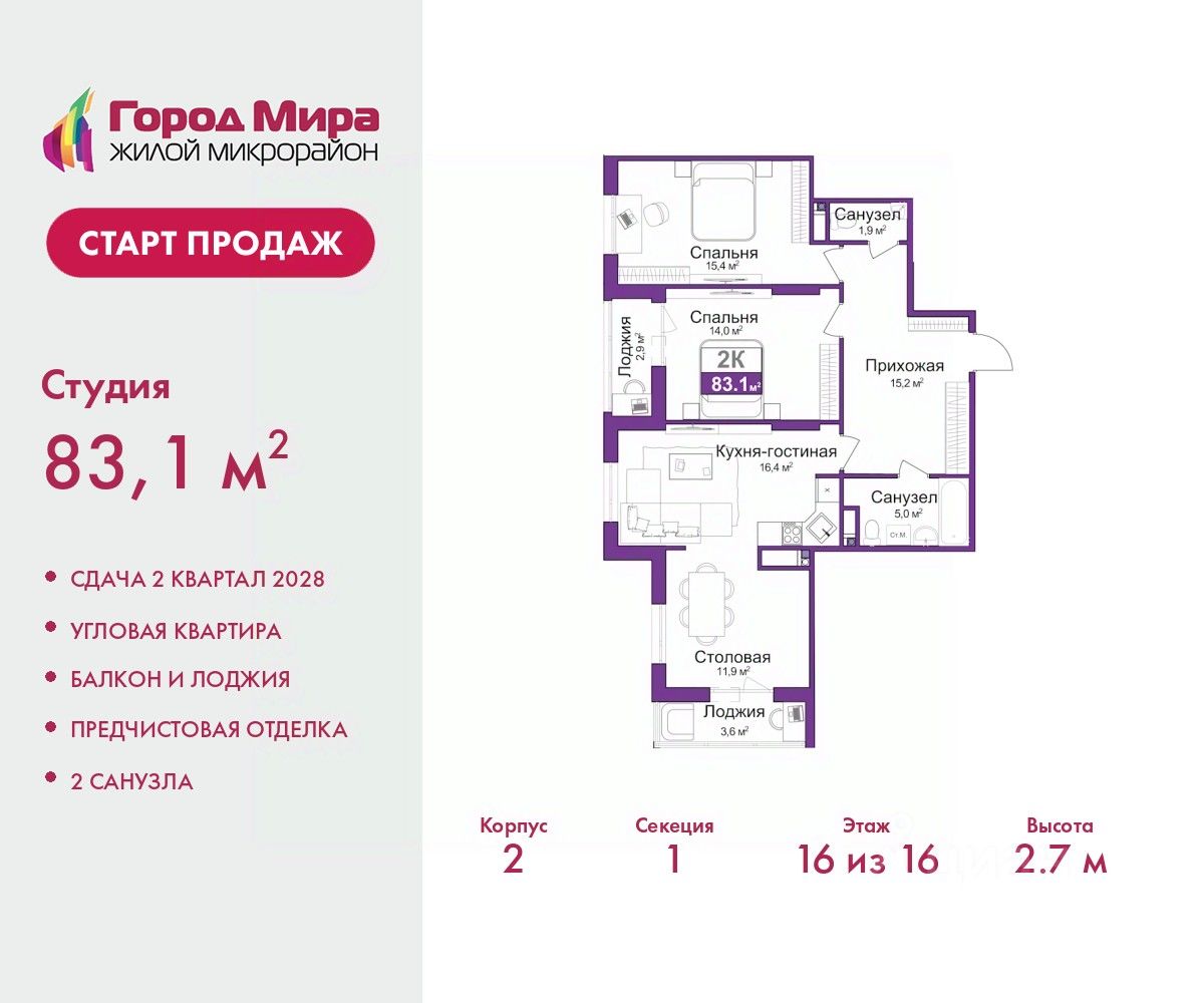Цена посчитана с учётом скидки 3% при полной оплате или ипотеке. Звоните, мы вам все подробно расскажем. Трехкомнатная квартира с европланировкой и предчистовой отделкой в ЖМ ''Город Мира'' на 16 этаже. Общая площадь: 83.1 кв.м., жилая: 41.3 кв.м., общая площадь гостиной-столовой с кухонной зоной: 28.3 кв.м. Европланировка, площадь комнат позволяет разместить в них все необходимое, а в просторной кухне-гостиной удобно как готовить, так и отдыхать. Квартира угловая, идеально подойдет любителям тишины и панорамных видов. В квартире один балкон и одна лоджия, один совмещенный и один раздельный санузел. Высота потолков 2.7 м. ''Город Мира'' это масштабный жилой комплекс, созданный для тех, кто ценит комфорт, безопасность и гармонию с природой. Здесь продумана каждая деталь от удобной инфраструктуры до эргономичных планировок квартир. ''Город Мира'' победил в номинации ''Лучший экологический проект года в сфере строительства'' по версии премии Сrimеа Urbаn Аwаrds. Способы приобретения недвижимости в ''Городе Мира'': 1. Ипотека: семейная от 5,5%, военная, IT-ипотека, базовая ипотечная программа и комбо-ипотека. Одобрение заявки проходит сразу в отделе продаж. 2. Материнский капитал на первый взнос. 3. Рассрочка от застройщика - до июня 2028 года! Первоначальный взнос от 30%. 4. Военная ипотека. Участники НИС могут приобрести квартиры по спец.цене. Ключевые преимущества комплекса: удачное расположение зеленый район с благоприятным микроклиматом продуманное зонирование жилые кварталы, зоны отдыха и коммерческие объекты комфорт-класс высокое качество строительства и современные инженерные решения Почему дом повышенной комфортности 2 в ''Городе Мира'' это лучшее решение? Образование и досуг: 2 детских сада (по 260 мест каждый) планируется строительство общеобразовательной школы детские и спортивные площадки в каждом дворе беседки для отдыха, зоны для выгула собак Ритейл и сервис: магазины, аптеки, медицинские центры фитнес-клубы, салоны красоты детские развивающие центры Парковки: гостевые парковки наземные и подземные паркинги Квартиры с продуманным комфортом: просторные планировки с кладовыми и колясочными лоджии с остеклением лапомойки для питомцев на первых этажах домов индивидуальное отопление выполнена стяжка пола и штукатурка стен консьерж-сервис для дополнительного удобства Благоустройство территории: ландшафтный дизайн с зонами отдыха современные детские площадки стильные холлы с дизайнерской отделкой система видеонаблюдения для безопасности ''Город Мира'' это место, где созданы все условия для комфортной жизни. Выбирайте качество и продуманность в каждой детали! Квартира находится во доме повышенной комфортности 2, 4-я очередь. Дом монолитно-каркасный, одноподъездный, высотой 16 этажей. В подъезде 1 пассажирский и 1 грузовой лифт. Окончание строительства - 2 квартал 2028 года. Оформление сделки по договору долевого участия. Квартира находится в корпусе 2. Дом монолитный, одноподъездный, высо