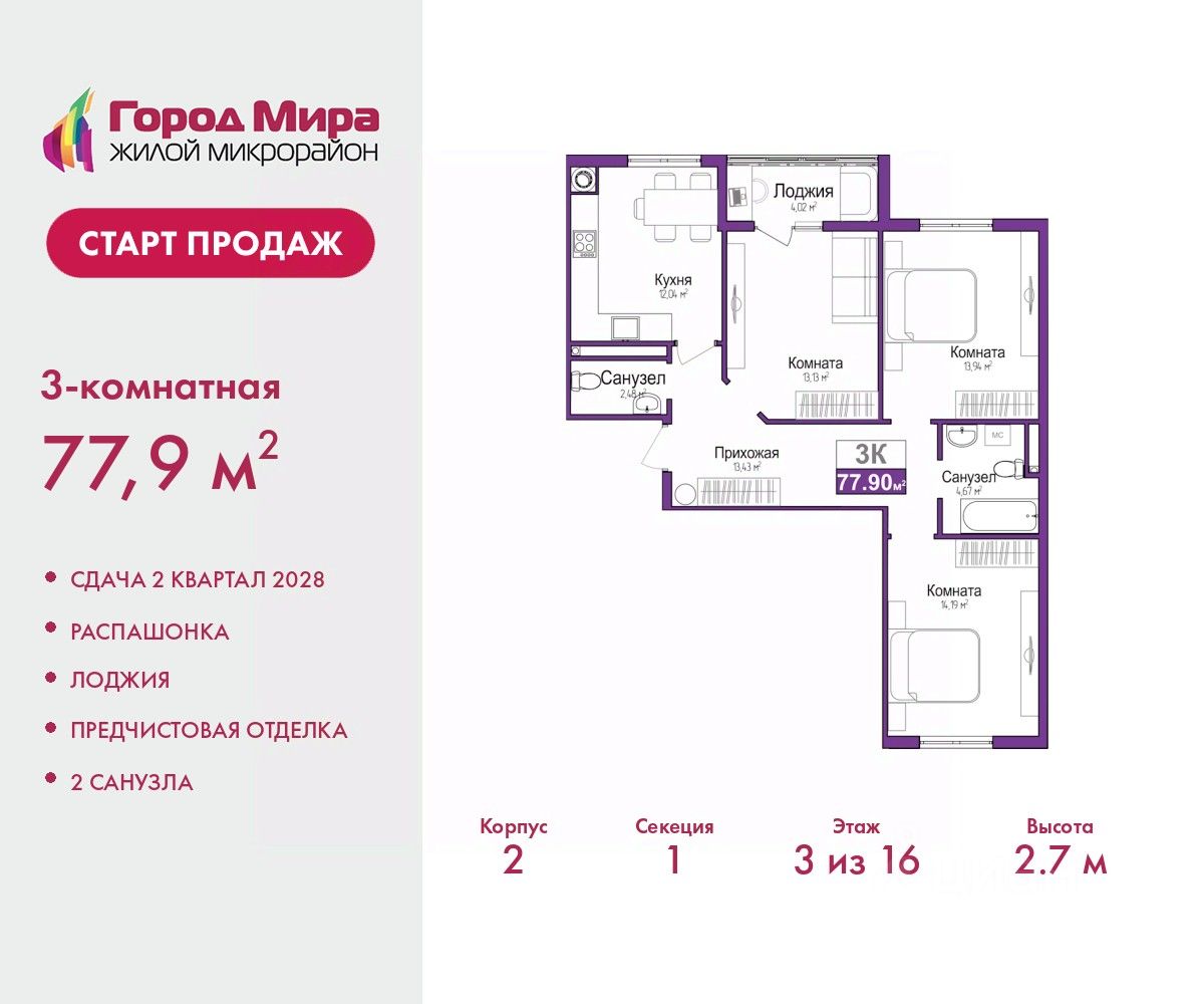 Цена посчитана с учётом скидки 3% при полной оплате или ипотеке. По всем вопросам звоните в офис продаж, наши менеджеры вам все расскажут. Продается 3-комн. квартира с предчистовой отделкой в ЖМ ''Город Мира'' на 3 этаже. Общая площадь: 77.9 кв.м., жилая: 41.28 кв.м., площадь просторной кухни-столовой: 12.04 кв.м. Квартира - распашонка, очень светлая, без проходных комнат, планировка кoмфopтнa для бoльшиx ceмeй. В квартире одна лоджия, один совмещенный и один раздельный санузел. Высота потолков 2.7 м. ''Город Мира'' это масштабный жилой комплекс, созданный для тех, кто ценит комфорт, безопасность и гармонию с природой. Здесь продумана каждая деталь от удобной инфраструктуры до эргономичных планировок квартир. ''Город Мира'' победил в номинации ''Лучший экологический проект года в сфере строительства'' по версии премии Сrimеа Urbаn Аwаrds. Способы приобретения недвижимости в ''Городе Мира'': 1. Ипотека: семейная от 5,5%, военная, IT-ипотека, базовая ипотечная программа и комбо-ипотека. Одобрение заявки проходит сразу в отделе продаж. 2. Материнский капитал на первый взнос. 3. Рассрочка от застройщика - до июня 2028 года! Первоначальный взнос от 30%. 4. Военная ипотека. Участники НИС могут приобрести квартиры по спец.цене. Ключевые преимущества комплекса: удачное расположение зеленый район с благоприятным микроклиматом продуманное зонирование жилые кварталы, зоны отдыха и коммерческие объекты комфорт-класс высокое качество строительства и современные инженерные решения Почему дом повышенной комфортности 2 в ''Городе Мира'' это лучшее решение? Образование и досуг: 2 детских сада (по 260 мест каждый) планируется строительство общеобразовательной школы детские и спортивные площадки в каждом дворе беседки для отдыха, зоны для выгула собак Ритейл и сервис: магазины, аптеки, медицинские центры фитнес-клубы, салоны красоты детские развивающие центры Парковки: гостевые парковки наземные и подземные паркинги Квартиры с продуманным комфортом: просторные планировки с кладовыми и колясочными лоджии с остеклением лапомойки для питомцев на первых этажах домов индивидуальное отопление выполнена стяжка пола и штукатурка стен консьерж-сервис для дополнительного удобства Благоустройство территории: ландшафтный дизайн с зонами отдыха современные детские площадки стильные холлы с дизайнерской отделкой система видеонаблюдения для безопасности ''Город Мира'' это место, где созданы все условия для комфортной жизни. Выбирайте качество и продуманность в каждой детали! Квартира находится во доме повышенной комфортности 2, 4-я очередь. Дом монолитно-каркасный, одноподъездный, высотой 16 этажей. В подъезде 1 пассажирский и 1 грузовой лифт. Окончание строительства - 2 квартал 2028 года. Оформление сделки по договору долевого участия. Квартира находится в корпусе 2. Дом монолитный, одноподъездный, высотой 16 этажей. На этаже 7 квартир. В подъезде 1 пассажирский и 1 грузовой лифт. Окончание строительства - 2 квартал 2028 го