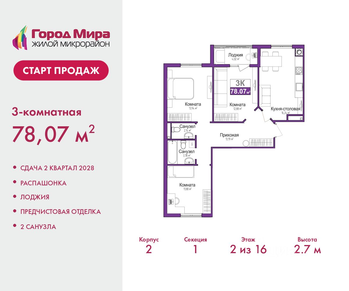 Цена посчитана с учётом скидки 3% при полной оплате или ипотеке. Звоните, мы вам все подробно расскажем. Просторная трехкомнатная квартира с предчистовой отделкой в ЖМ ''Город Мира'' на 2 этаже. Общая площадь: 78.07 кв.м., жилая: 38.7 кв.м., площадь просторной кухни-столовой: 16.25 кв.м. Квартира - распашонка, без проходных комнат, окна выходят на paзные стороны дома. В квартире одна лоджия, один совмещенный и один раздельный санузел. Высота потолков 2.7 м. ''Город Мира'' это масштабный жилой комплекс, созданный для тех, кто ценит комфорт, безопасность и гармонию с природой. Здесь продумана каждая деталь от удобной инфраструктуры до эргономичных планировок квартир. ''Город Мира'' победил в номинации ''Лучший экологический проект года в сфере строительства'' по версии премии Сrimеа Urbаn Аwаrds. Способы приобретения недвижимости в ''Городе Мира'': 1. Ипотека: семейная от 5,5%, военная, IT-ипотека, базовая ипотечная программа и комбо-ипотека. Одобрение заявки проходит сразу в отделе продаж. 2. Материнский капитал на первый взнос. 3. Рассрочка от застройщика - до июня 2028 года! Первоначальный взнос от 30%. 4. Военная ипотека. Участники НИС могут приобрести квартиры по спец.цене. Ключевые преимущества комплекса: удачное расположение зеленый район с благоприятным микроклиматом продуманное зонирование жилые кварталы, зоны отдыха и коммерческие объекты комфорт-класс высокое качество строительства и современные инженерные решения Почему дом повышенной комфортности 2 в ''Городе Мира'' это лучшее решение? Образование и досуг: 2 детских сада (по 260 мест каждый) планируется строительство общеобразовательной школы детские и спортивные площадки в каждом дворе беседки для отдыха, зоны для выгула собак Ритейл и сервис: магазины, аптеки, медицинские центры фитнес-клубы, салоны красоты детские развивающие центры Парковки: гостевые парковки наземные и подземные паркинги Квартиры с продуманным комфортом: просторные планировки с кладовыми и колясочными лоджии с остеклением лапомойки для питомцев на первых этажах домов индивидуальное отопление выполнена стяжка пола и штукатурка стен консьерж-сервис для дополнительного удобства Благоустройство территории: ландшафтный дизайн с зонами отдыха современные детские площадки стильные холлы с дизайнерской отделкой система видеонаблюдения для безопасности ''Город Мира'' это место, где созданы все условия для комфортной жизни. Выбирайте качество и продуманность в каждой детали! Квартира находится во доме повышенной комфортности 2, 4-я очередь. Дом монолитно-каркасный, одноподъездный, высотой 16 этажей. В подъезде 1 пассажирский и 1 грузовой лифт. Окончание строительства - 2 квартал 2028 года. Оформление сделки по договору долевого участия. Квартира находится в корпусе 2. Дом монолитный, одноподъездный, высотой 16 этажей. На этаже 7 квартир. В подъезде 1 пассажирский и 1 грузовой лифт. Окончание строительства - 2 квартал 2028 года. Оформление сделки по договору долевого уч