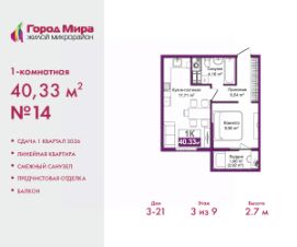 Просторная 1-комн. квартира с предчистовой отделкой в ЖМ ''Город Мира'' на 3 этаже. Общая площадь: 40.33 кв.м., жилая: 9.96 кв.м., площадь просторной кухни-столовой: 17.71 кв.м. Все окна выходят на одну сторону. В квартире один балкон, один совмещенный санузел. Высота потолков 2.7 м. Жилой комплекс ''Город Мира'' комфорт и гармония в современном формате. ''Город Мира'' это масштабный жилой комплекс, созданный для тех, кто ценит комфорт, безопасность и гармонию с природой. Здесь продумана каждая деталь от удобной инфраструктуры до эргономичных планировок квартир. В 2024 году микрорайон ''Город Мира'' победил в номинации ''Лучший экологический проект года в сфере строительства'' по версии премии Crimea Urban Awards. Ключевые преимущества комплекса:- удачное расположение зеленый район с благоприятным микроклиматом- продуманное зонирование жилые кварталы, зоны отдыха и коммерческие объекты- комфорт-класс высокое качество строительства и современные инженерные решения Инфраструктура ''Города Мира'': Образование и досуг:- 2 детских сада (по 260 мест каждый)- планируется строительство общеобразовательной школы- детские и спортивные площадки в каждом дворе- беседки для отдыха, зоны для выгула собак Ритейл и сервис:- магазины, аптеки, медицинские центры- фитнес-клубы, салоны красоты- детские развивающие центры Парковки:- гостевые парковки- наземные и подземные паркинги Квартиры с продуманным комфортом:- просторные планировки с кладовыми и колясочными- лоджии с остеклением- автономное отопление (по 23 дому: индивидуальное отопление)- выполнена стяжка пола (по 3, 4, 20, 21, 22 домам: выполненная стяжка пола и штукатурка стен) - Консьерж-сервис для дополнительного удобства Благоустройство территории:- ландшафтный дизайн с зонами отдыха- современные детские площадки- стильные холлы с дизайнерской отделкой- система видеонаблюдения для безопасности ''Город Мира'' это место, где созданы все условия для комфортной жизни. Выбирайте качество и продуманность в каждой детали! Квартира находится в корпусе 3_21. Дом монолитный, одноподъездный, высотой 9 этажей. В подъезде 1 грузовой лифт. Окончание строительства - 1 квартал 2026 года. Оформление сделки по договору долевого участия. #2mmzuE