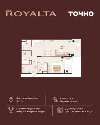 Жилой комплекс ''РОЯЛТА'' включает 5 монолитно-кирпичных девятиэтажных зданий. Проект предлагает квартиры различных планировок: от однокомнатных до трехкомнатных с расширенными балконами и террасами до 13,4 м2. Территория будет благоустроена детскими игровыми и спортивными площадками, гостевой автостоянкой и озеленением, включая газоны, деревья и кустарники. Также появятся современные уличные тренажёры, СПА-комплекс и панорамный инфинити-бассейн. В шаговой доступности находятся центральная набережная Ялты, детские сады, школы, супермаркеты, торговые центры, Ялтинский медицинский колледж, автовокзал и Мордвиновский парк.