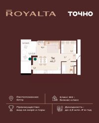 Жилой комплекс ''РОЯЛТА'' включает 5 монолитно-кирпичных девятиэтажных зданий. Проект предлагает квартиры различных планировок: от однокомнатных до трехкомнатных с расширенными балконами и террасами до 13,4 м2. Территория будет благоустроена детскими игровыми и спортивными площадками, гостевой автостоянкой и озеленением, включая газоны, деревья и кустарники. Также появятся современные уличные тренажёры, СПА-комплекс и панорамный инфинити-бассейн. В шаговой доступности находятся центральная набережная Ялты, детские сады, школы, супермаркеты, торговые центры, Ялтинский медицинский колледж, автовокзал и Мордвиновский парк.