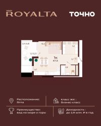 Жилой комплекс ''РОЯЛТА'' включает 5 монолитно-кирпичных девятиэтажных зданий. Проект предлагает квартиры различных планировок: от однокомнатных до трехкомнатных с расширенными балконами и террасами до 13,4 м2. Территория будет благоустроена детскими игровыми и спортивными площадками, гостевой автостоянкой и озеленением, включая газоны, деревья и кустарники. Также появятся современные уличные тренажёры, СПА-комплекс и панорамный инфинити-бассейн. В шаговой доступности находятся центральная набережная Ялты, детские сады, школы, супермаркеты, торговые центры, Ялтинский медицинский колледж, автовокзал и Мордвиновский парк.