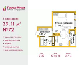Однокомнатная квартира с предчистовой отделкой в ЖМ ''Город Мира'' на 12 этаже. Общая площадь: 39.11 кв.м., жилая: 22.56 кв.м., площадь кухни: 5 кв.м. Все окна выходят на одну сторону. В квартире одна лоджия, один совмещенный санузел. Высота потолков 2.7 м. Жилой комплекс ''Город Мира'' комфорт и гармония в современном формате. ''Город Мира'' это масштабный жилой комплекс, созданный для тех, кто ценит комфорт, безопасность и гармонию с природой. Здесь продумана каждая деталь от удобной инфраструктуры до эргономичных планировок квартир. В 2024 году микрорайон ''Город Мира'' победил в номинации ''Лучший экологический проект года в сфере строительства'' по версии премии Crimea Urban Awards. Ключевые преимущества комплекса:- удачное расположение зеленый район с благоприятным микроклиматом- продуманное зонирование жилые кварталы, зоны отдыха и коммерческие объекты- комфорт-класс высокое качество строительства и современные инженерные решения Инфраструктура ''Города Мира'': Образование и досуг:- 2 детских сада (по 260 мест каждый)- планируется строительство общеобразовательной школы- детские и спортивные площадки в каждом дворе- беседки для отдыха, зоны для выгула собак Ритейл и сервис:- магазины, аптеки, медицинские центры- фитнес-клубы, салоны красоты- детские развивающие центры Парковки:- гостевые парковки- наземные и подземные паркинги Квартиры с продуманным комфортом:- просторные планировки с кладовыми и колясочными- лоджии с остеклением- автономное отопление (по 23 дому: индивидуальное отопление)- выполнена стяжка пола (по 3, 4, 20, 21, 22 домам: выполненная стяжка пола и штукатурка стен) - Консьерж-сервис для дополнительного удобства Благоустройство территории:- ландшафтный дизайн с зонами отдыха- современные детские площадки- стильные холлы с дизайнерской отделкой- система видеонаблюдения для безопасности ''Город Мира'' это место, где созданы все условия для комфортной жизни. Выбирайте качество и продуманность в каждой детали! Квартира находится в корпусе 3_23. Дом монолитный, одноподъездный, высотой 16 этажей. В подъезде 1 пассажирский и 1 грузовой лифт. Окончание строительства - 1 квартал 2026 года. Оформление сделки по договору долевого участия. #2MB57e