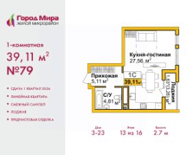 Продается однокомнатная квартира с предчистовой отделкой в ЖМ ''Город Мира'' на 13 этаже. Общая площадь: 39.11 кв.м., жилая: 22.56 кв.м., площадь кухни: 5 кв.м. Все окна выходят на одну сторону. В квартире одна лоджия, один совмещенный санузел. Высота потолков 2.7 м. Жилой комплекс ''Город Мира'' комфорт и гармония в современном формате. ''Город Мира'' это масштабный жилой комплекс, созданный для тех, кто ценит комфорт, безопасность и гармонию с природой. Здесь продумана каждая деталь от удобной инфраструктуры до эргономичных планировок квартир. В 2024 году микрорайон ''Город Мира'' победил в номинации ''Лучший экологический проект года в сфере строительства'' по версии премии Crimea Urban Awards. Ключевые преимущества комплекса:- удачное расположение зеленый район с благоприятным микроклиматом- продуманное зонирование жилые кварталы, зоны отдыха и коммерческие объекты- комфорт-класс высокое качество строительства и современные инженерные решения Инфраструктура ''Города Мира'': Образование и досуг:- 2 детских сада (по 260 мест каждый)- планируется строительство общеобразовательной школы- детские и спортивные площадки в каждом дворе- беседки для отдыха, зоны для выгула собак Ритейл и сервис:- магазины, аптеки, медицинские центры- фитнес-клубы, салоны красоты- детские развивающие центры Парковки:- гостевые парковки- наземные и подземные паркинги Квартиры с продуманным комфортом:- просторные планировки с кладовыми и колясочными- лоджии с остеклением- автономное отопление (по 23 дому: индивидуальное отопление)- выполнена стяжка пола (по 3, 4, 20, 21, 22 домам: выполненная стяжка пола и штукатурка стен) - Консьерж-сервис для дополнительного удобства Благоустройство территории:- ландшафтный дизайн с зонами отдыха- современные детские площадки- стильные холлы с дизайнерской отделкой- система видеонаблюдения для безопасности ''Город Мира'' это место, где созданы все условия для комфортной жизни. Выбирайте качество и продуманность в каждой детали! Квартира находится в корпусе 3_23. Дом монолитный, одноподъездный, высотой 16 этажей. В подъезде 1 пассажирский и 1 грузовой лифт. Окончание строительства - 1 квартал 2026 года. Оформление сделки по договору долевого участия. #2mem0I