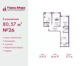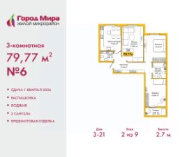 Продается 3-комн. квартира от застройщика с предчистовой отделкой в ЖМ ''Город Мира'' на 6 этаже. Общая площадь: 80.57 кв.м., жилая: 45.88 кв.м., площадь просторной кухни-столовой: 12.04 кв.м. Квартира - распашонка, без проходных комнат, окна выходят на paзные стороны дома. В квартире одна лоджия, один совмещенный и один раздельный санузел. Высота потолков 2.7 м. Квартиры в ЖК ''Город Мира'' ваш комфорт начинается здесь! ''Город Мира'' это масштабный жилой комплекс, созданный для тех, кто ценит комфорт, безопасность и гармонию с природой. Здесь продумана каждая деталь: от удобной инфраструктуры до эргономичных планировок квартир. В 2024 году микрорайон ''Город Мира'' победил в номинации ''Лучший экологический проект года в сфере строительства'' по версии премии Crimea Urban Awards. Почему выбирают наш комплекс: - Зеленый оазис живите среди природы в черте города.- Всё под рукой 2 детских сада, магазины, фитнес, медицина. - Безопасность: закрытая территория с видеонаблюдением. Наши квартиры: - Просторные планировки с кладовыми. - Лоджии с остеклением.- Автономное отопление: платите только за реальное потребление. - Предчистовая отделка, включает стяжку пола, без штукатурки стен. - Консьерж-сервис и подземный паркинг. Инфраструктура комплекса: - Детские и спортивные площадки. - Зоны отдыха с беседками. - Фитнес-клубы и салоны красоты. - Будущая школа на территории, уже функционируют два детских сада. Выгодные условия покупки: - Ипотека от 5,5%, военная ипотека от 5,5%. - Рассрочка. - Материнский капитал на первоначальный взнос. Квартира находится в корпусе 5_4.3. Дом монолитный, одноподъездный, высотой 9 этажей. В подъезде 1 грузовой лифт. Окончание строительства - 4 квартал 2026 года. Оформление сделки по договору долевого участия. #Z6MBuz